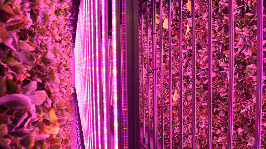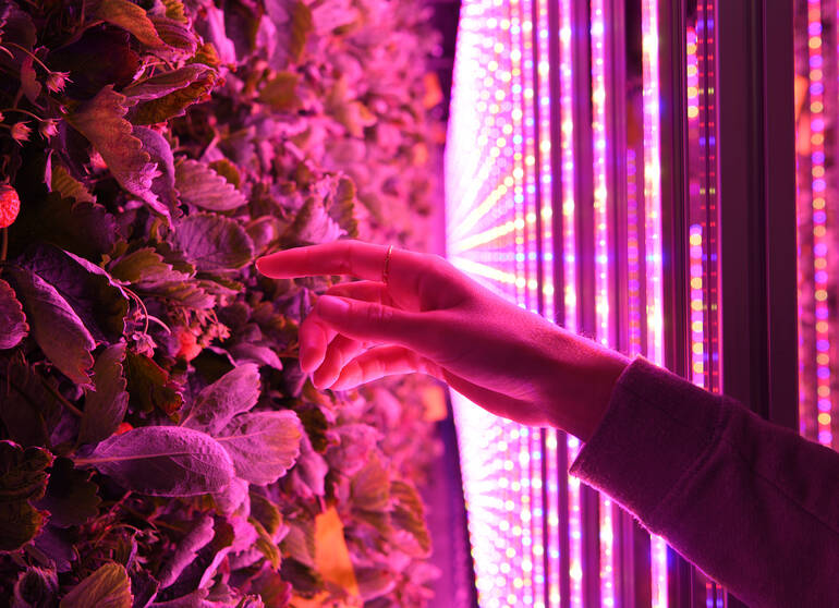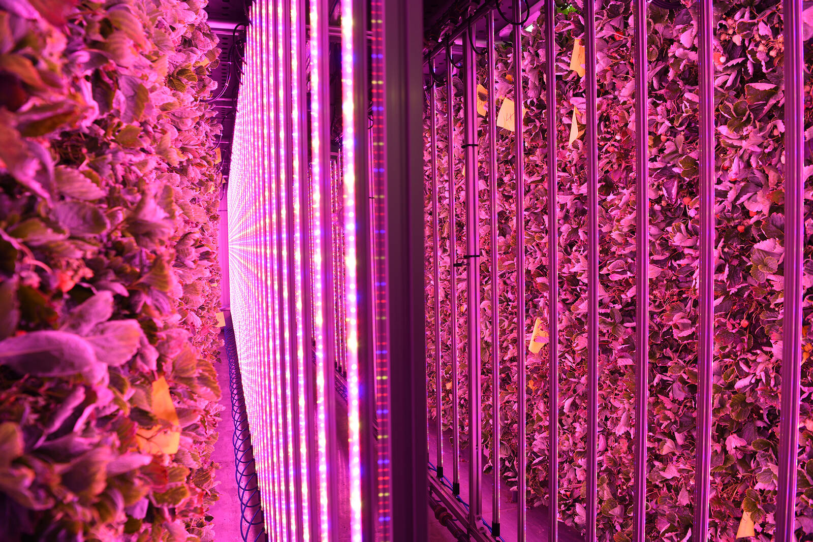 Les plantes sont exposées à une combinaison de leds de couleurs différentes qui reconstituent la lumière du soleil. Les lampes sont éteintes la nuit pour permettre aux plantes de se reposer et respecter le cycle naturel. L’énergie utilisée pour le fonctionnement du container est 100% renouvelable.