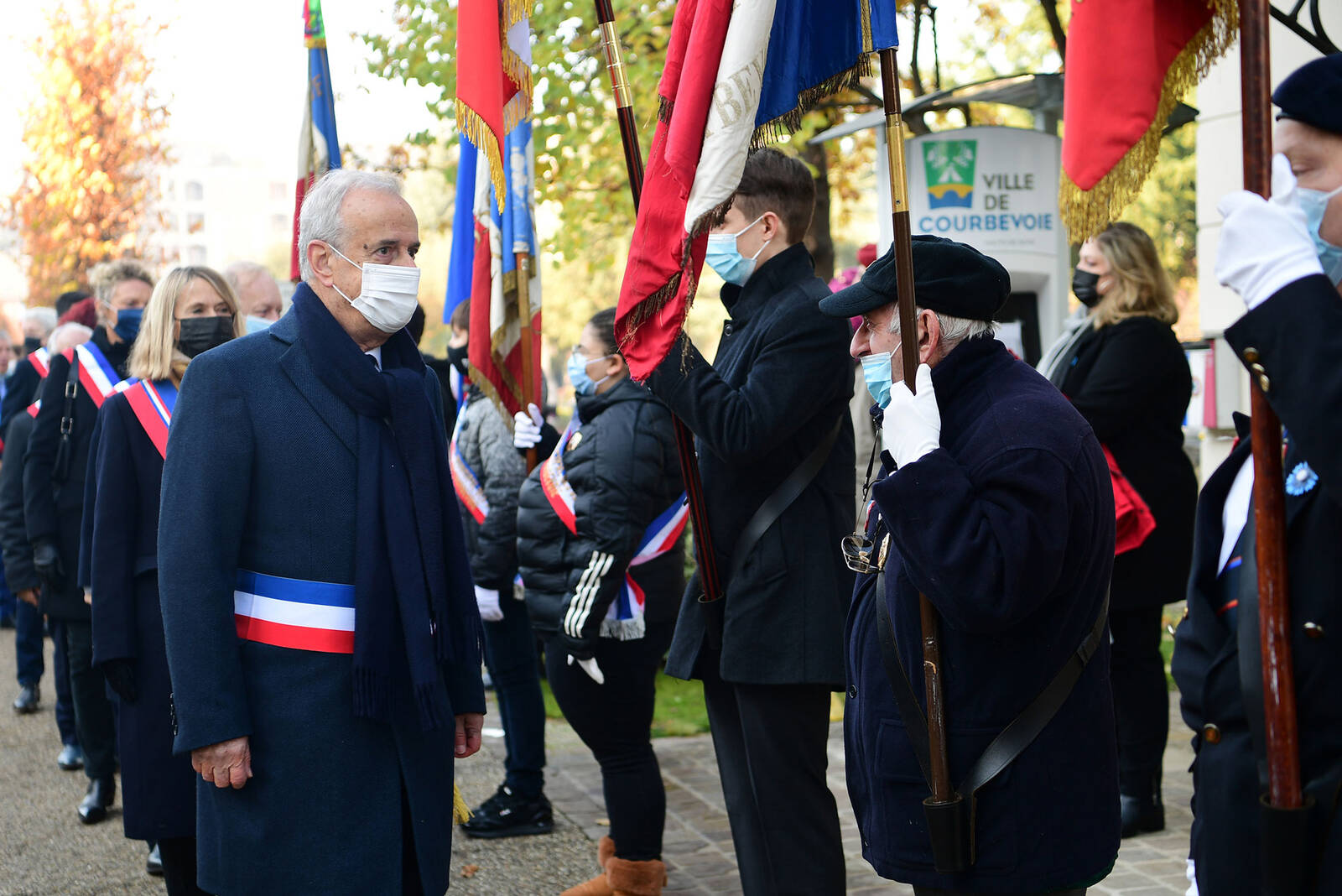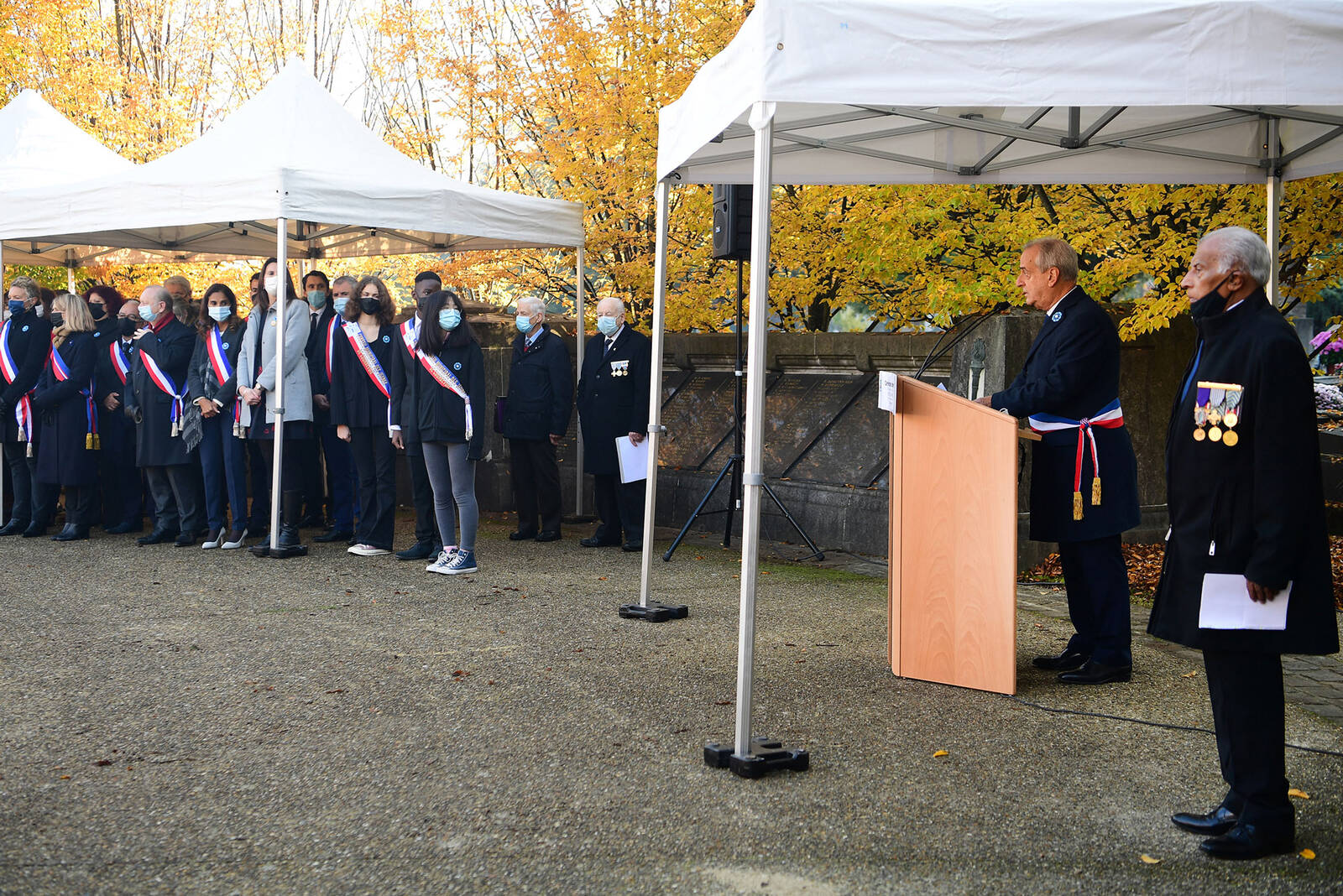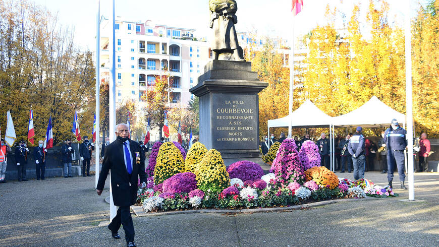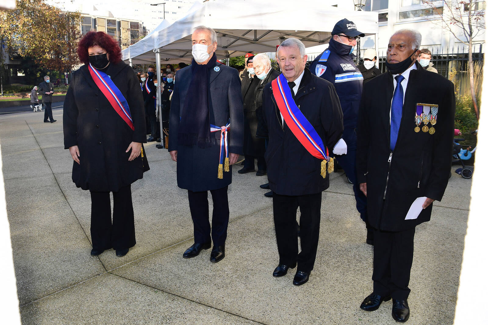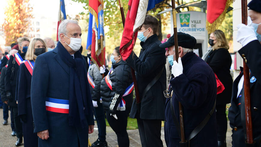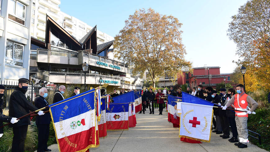 103e anniversaire de l'Armistice de 1918, ce matin au square de l'hôtel de ville et aux monuments aux morts du cimetière des Fauvelles, M. le Maire et les élus de Courbevoie ont rendu hommage à tous les soldats morts pour la France.