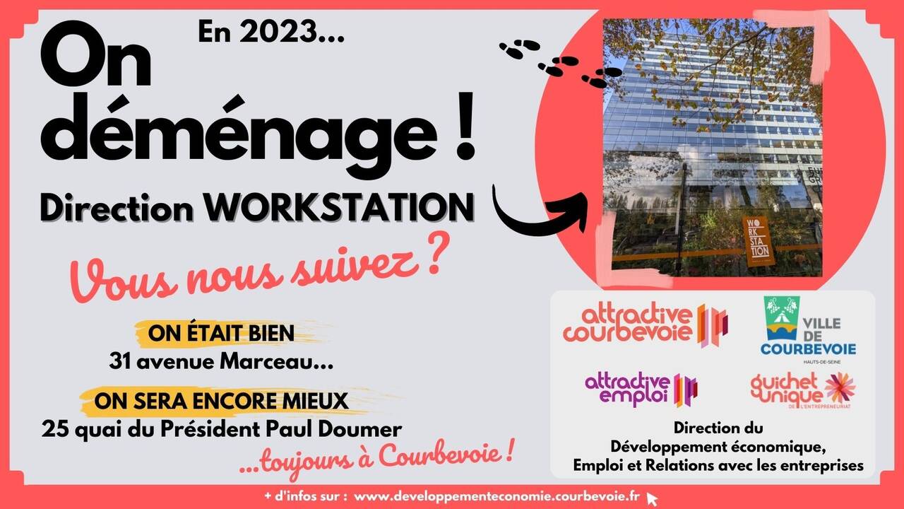 A compter du lundi 9 janvier 2023, les équipes d’Attractive Courbevoie vous accueilleront dans ses nouveaux locaux, au rez-de-chaussée de l’immeuble Workstation à Courbevoie.