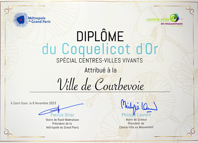 Créés par l’association Centre-ville en mouvement et organisé par la Métropole du Grand Paris, les diplômes du Coquelicot d’or récompensent les communes qui agissent pour l’attractivité de leurs centres-villes. Cette distinction salue l’ardeur, l’action et le dynamisme des élus qui oeuvrent au quotidien et favorisent les mises en réseau au service de l’attractivité économique et culturelle, dans un esprit de développement durable et d’innovation et une quête de renouveau face au développement du e-commerce.