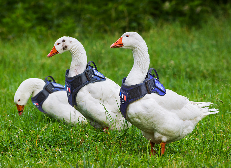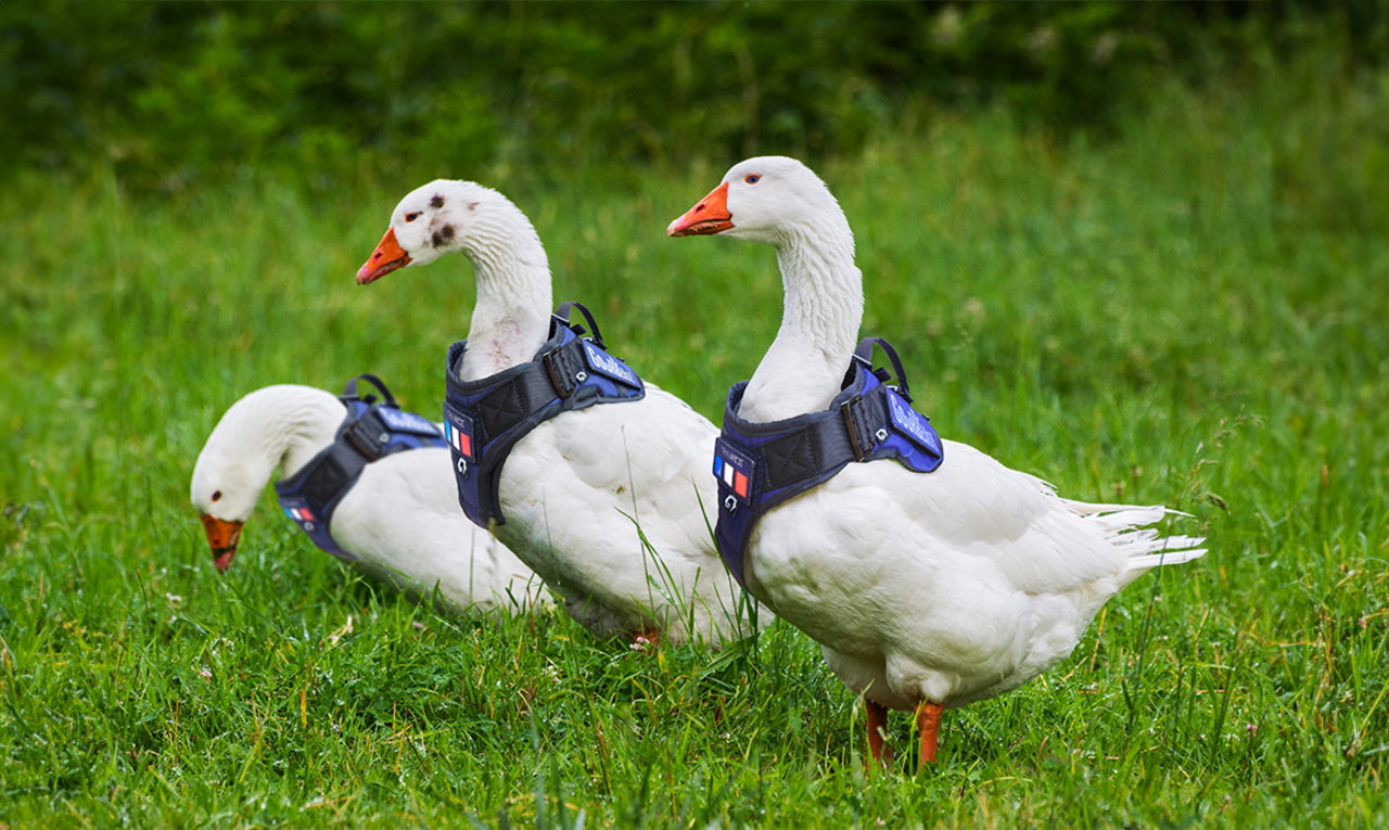 Les oies de la ville seront facilement reconnaissables avec leurs harnais tactiques. Le logo de la ville y sera apparent (voir la photo des oies en situation, ci-dessus). D’autres équipements composent le harnais des oies : une puce GPS, une caméra vidéo activable à distance ainsi qu’un haut-parleur de 15 watts. Les opérateurs pourront l’activer en fonction du retour vidéo et transmettre des instructions, comme demander de quitter les lieux. Dans le cas contraire, les contrevenants pourraient y laisser des plumes. Dernière innovation, un micro omnidirectionnel est intégré dans la poignée. Couplé à un microprocesseur, un logiciel enrichi à l’intelligence artificielle détecte la voix humaine, même à bas volume, dans un rayon de cinq mètres.