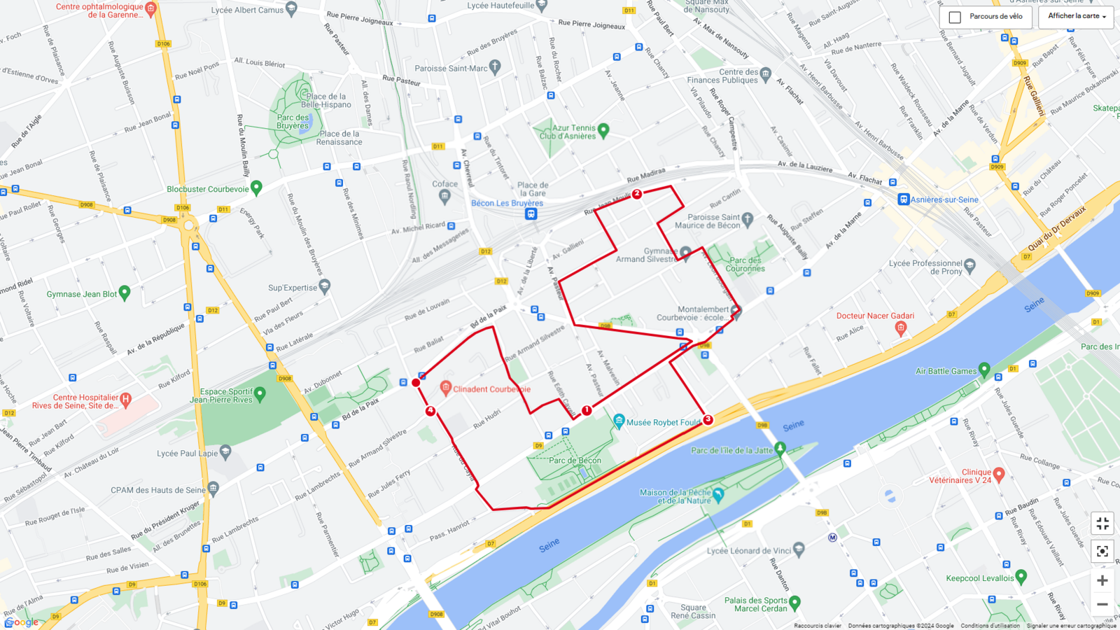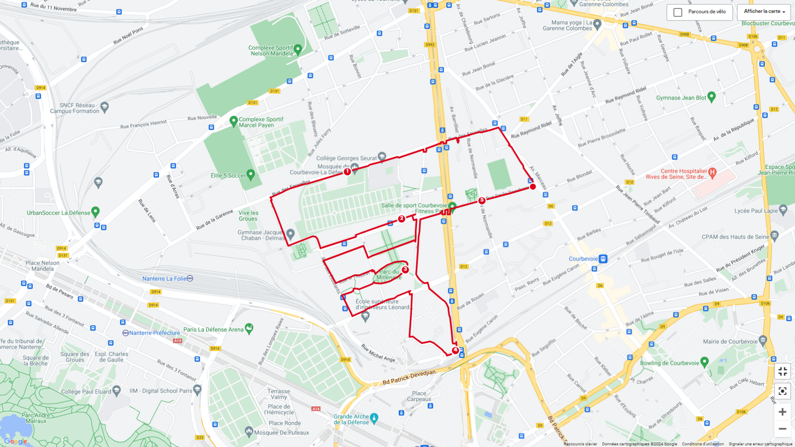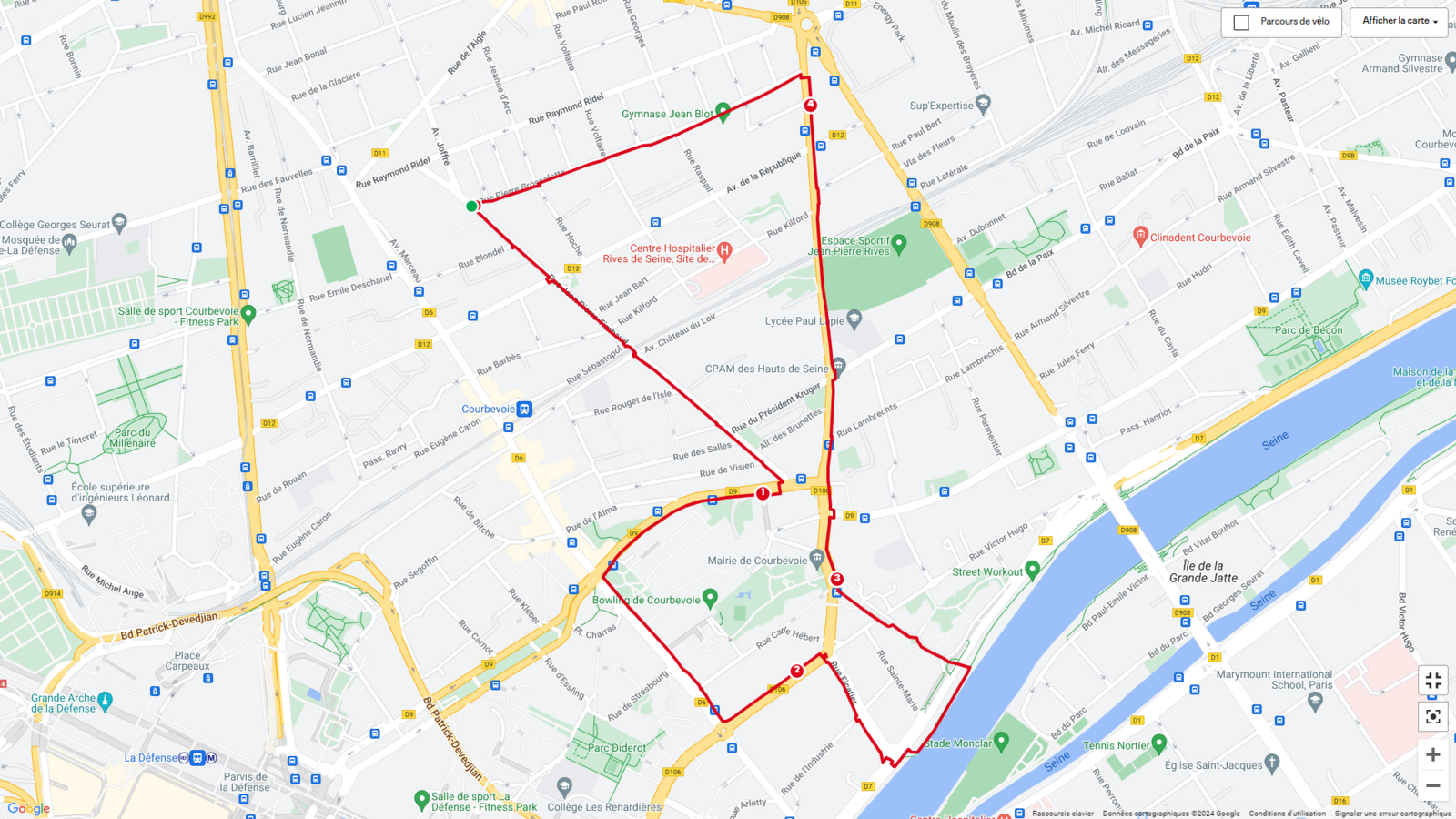 Ces parcours votés par les Courbevoisiens pour la troisième édition du budget participatif et validés par les conseillers de quartier, sont disponibles en ligne sur l'application "mapmyrun", des balises matérialisant ces parcours sont disposées tout du long de ces parcours :
