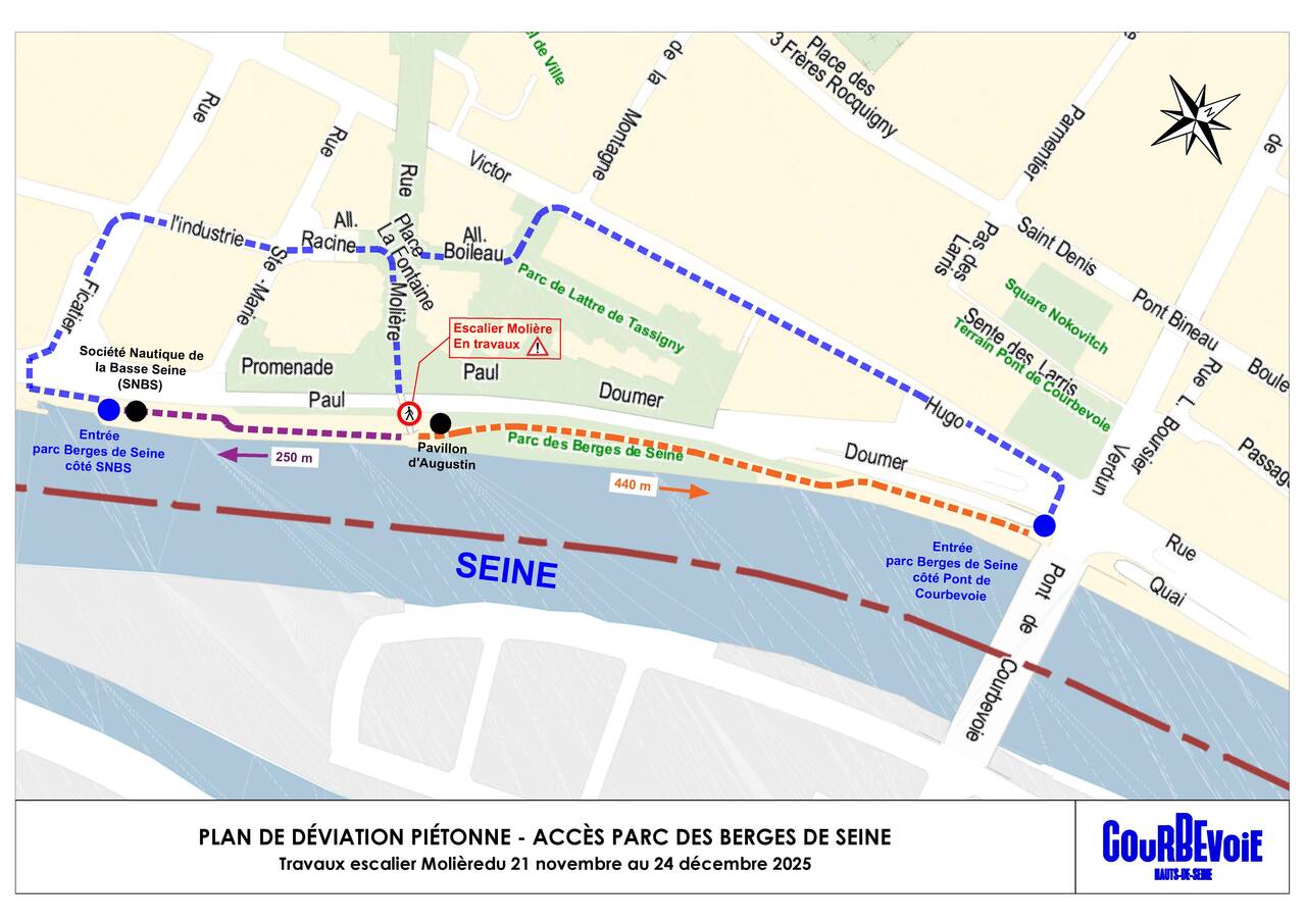 L'escalier au bout de la rue Molière, menant aux berges de Seine - promenade Paul Doumer, sera fermé pour travaux du 21 novembre au 24 décembre 2025, en raison de la mise en place d'une structure métallique et bois composite, en remplacement de la structure en bois dégradée.