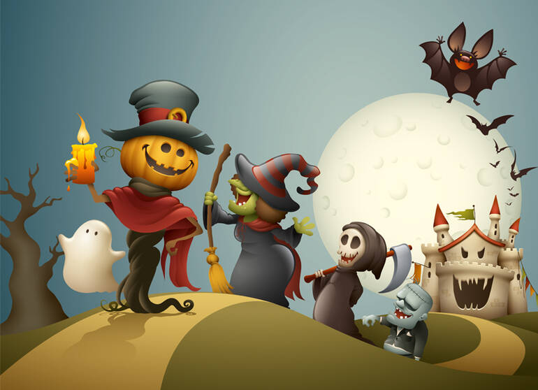 - Décorations : monstres, sorcières, fantômes, citrouilles, toiles d’araignée…