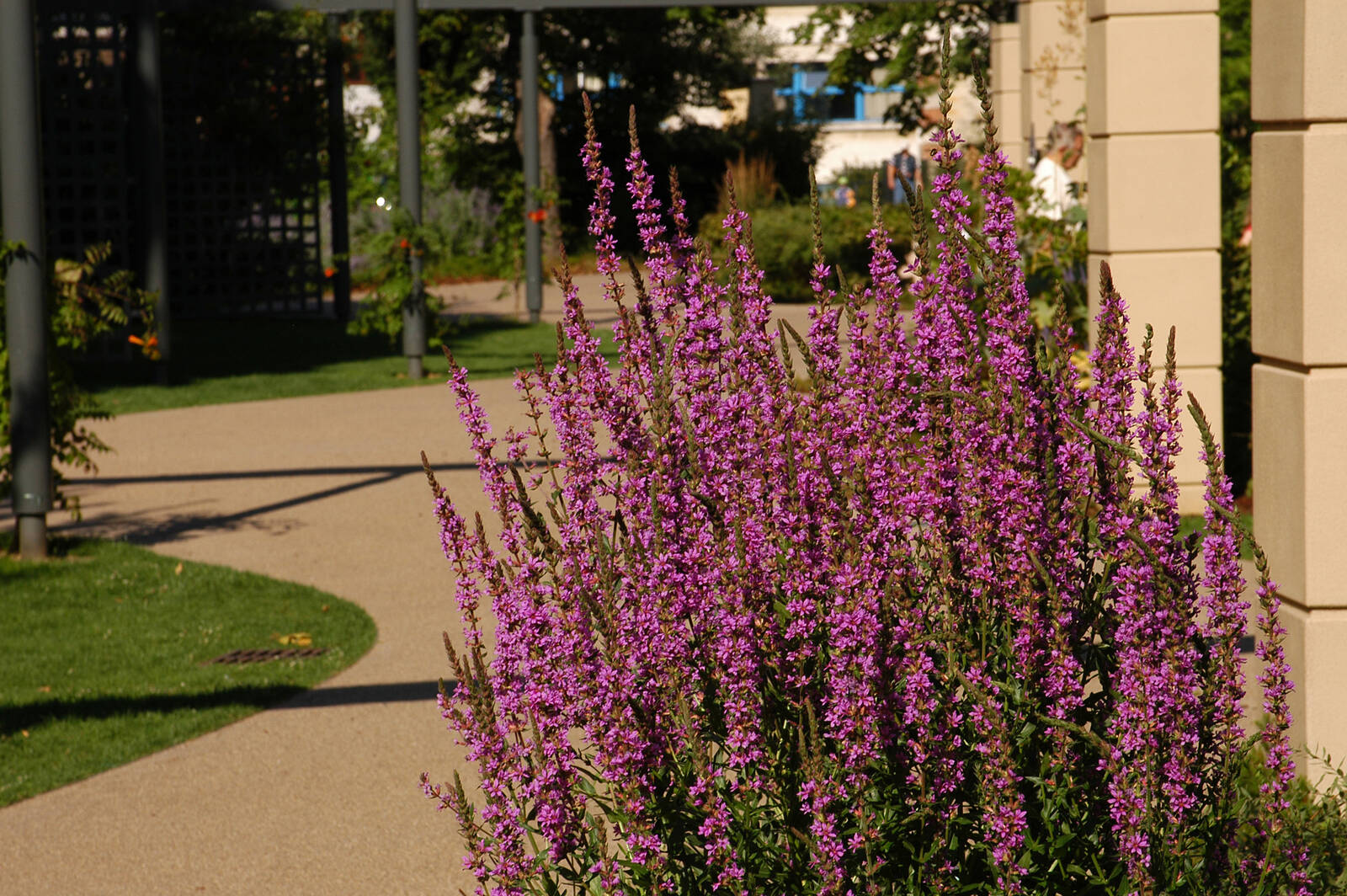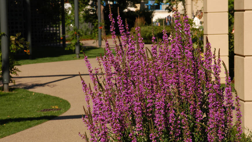 Des murs et des arceaux de couleur vert clair permettent à des plantes grimpantes parfumées de croître (clématites, chèvrefeuilles, glycines, rosiers…). D’autres senteurs sont dues aux fleurs de plantes comme aliboufier, arbre aux épaulettes, drégée de Chine, iris, œillets, orangers du Mexique, pivoines, robinier à fleurs rouges, seringats et toute une collection de rosiers dont le célèbre ‘Ville de Courbevoie’.Des bancs courbes et des gloriettes en osier vivant tressé soulignent le tracé sinueux des allées du jardin animé également par une prairie fleurie.