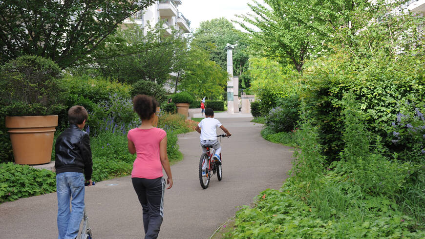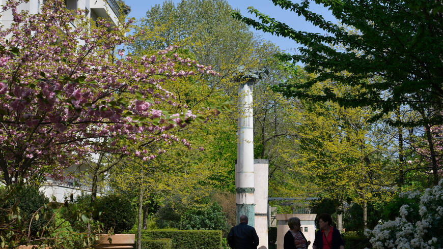 Au centre de celui-ci, à la croisée de la seconde allée principale, une placette centrale dallée de forme ronde à l'ombre de féviers d'Amérique est animée par une sculpture d'Ivan Theimer, 3 colonnes "à déchiffrer" (2002 ).