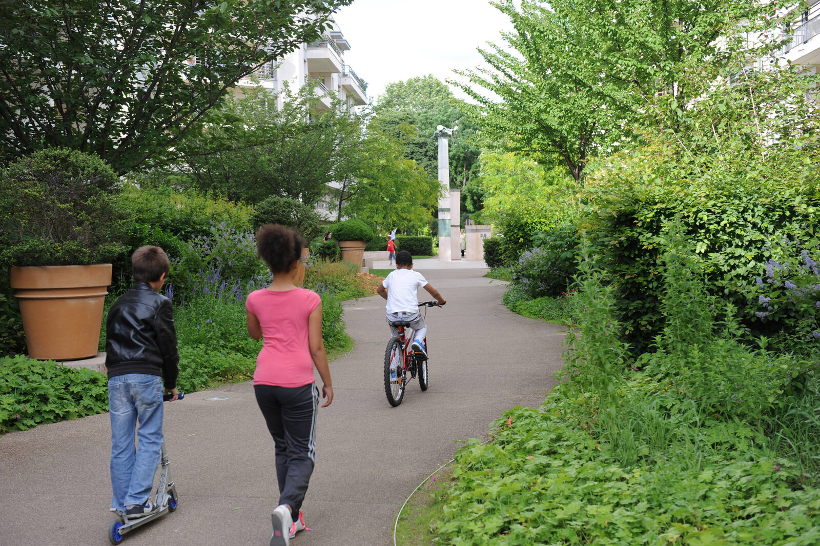 Sur un terrain libéré par les usines Thomson en 1999, ce jardin a été réalisé en 2003. Derrière de grands portails ouvragés, ce jardin reliant la rue de Colombes à la rue Jean-Pierre Timbaud constituant, associé au jardin de la bibliothèque principale, agréable promenade traversante marquée à l'ouest comme par deux signaux végétaux, des cèdres bleus de l'Atlas fastigiés .