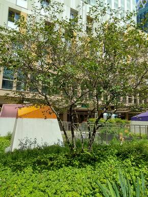 Je suis planté dans la ligne la plus au nord du square des Corolles, géré par Paris La Défense. A proximité des cinq oculi de l’entrepont, de couleurs jaune, rouge, violette, orange et rose, cette ligne comprend quatre cépées d’amélanchiers du Canada dont je suis le premier. L’un d’entre nous supporte un nichoir. Nous sommes plantés sur une plate-bande riche de petites pervenches, d’aulx d’ornement, d’iris et d’hellébores fétides. Dynamisant la composition de ce square, deux autres alignements parallèles d’arbrisseaux en cépées sont à remarquer, le premier composé de cinq lilas des Indes et le troisième de deux cerisiers à fleurs. Les couleurs de ces trois essences apportent de l’animation au cœur de ce patio de la résidence « Lorraine ».