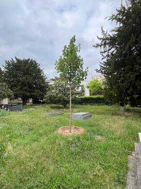 Je suis situé dans le centre du parc du Vieux cimetière, dans la partie paysagère et non loin du charme commun et du cèdre bleu de l’Atlas (Cedrus atlantica ‘Glauca’). J’ai été planté le 7 avril 2025 à l’initiative de la société N2B Arrosage, prestataire d’arrosage de la ville lors d’un marché public, pour symboliquement compenser ses émissions de CO2. Je suis donc en quelque sorte un arbre impliqué dans la compensation carbone. Au fil des années, ce parc est devenu un arboretum. Géré dans une démarche de gestion différenciée respectueuse de la biodiversité, ce cimetière dont l’allée principale est soulignée par deux haies de charmes de chaque côté est rythmée par plusieurs arceaux en charme également. Il est aussi riche d’orchidées sauvages, de tulipes botaniques, d’une haie d’essences locales et surtout d’une très belle collection d’arbres. Dans celle-ci, huit autres arbres sont identifiables par flashcode : un arbre à liège de l’Amour, un charme commun, un chitalpa de Tachkent, un frêne du Caucase à feuillage automnal pourpre, un if commun, un margousier, un oranger des Osages et un séquoia pleureur.