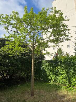 Je suis situé dans l’angle nord-ouest du parc du Vieux cimetière, pas très loin des tombes de six soldats allemands morts en 1870 lors des combats de « La Défense » et du tilleul de Mongolie, décrété « arbre majeur ». Je pousse à proximité d’une belle cépée de laurier-tin (Viburnum tinus). Au fil des années, ce parc est devenu un arboretum. Géré dans une démarche de gestion différenciée respectueuse de la biodiversité, ce cimetière dont l’allée principale est soulignée par deux haies de charmes de chaque côté et rythmée par plusieurs arceaux, en charme également. Il est aussi riche d’orchidées sauvages, d’une haie d’essences locales et surtout d’une très belle collection d’arbres. Dans celle-ci, huit autres arbres sont identifiables par flashcode : un arbre à liège de l’Amour, un charme commun, un chitalpa de Tachkent, un frêne du Caucase à feuillage automnal pourpre, un if commun, un margousier un marronnier jaune et un séquoia pleureur.