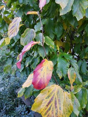 Mes feuilles caduques, elliptiques et brillantes sont asymétriques avec la moitié supérieure du contour du limbe irrégulièrement ondulée. Elles mesurent de 6 à 10 centimètres de long. Elles sont vert clair brillant devenant remarquables à l’automne, en prenant des couleurs mêlant le vert, le jaune, l’orange, le cramoisi et le pourpre. Ces couleurs flamboyantes sont visibles dès le mois d’août jusqu’à la fin de l’automne.