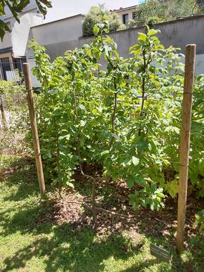 Elément emblématique de cette forêt nourricière, ce pommier est conduit en palmette Verrier double U. Il est planté parmi les framboisiers, à proximité de l’allée traversante du square Volta.