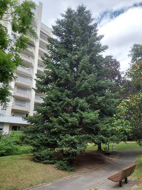 Ce beau conifère est situé dans le centre du parc des Bruyères, riche d’un très beau patrimoine arboré. Ce sapin de Grèce est à remarquer pour la disposition particulière de ses aiguilles, en écouvillons autour de ses branches.