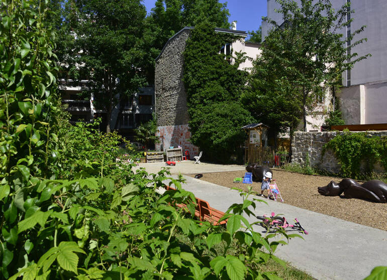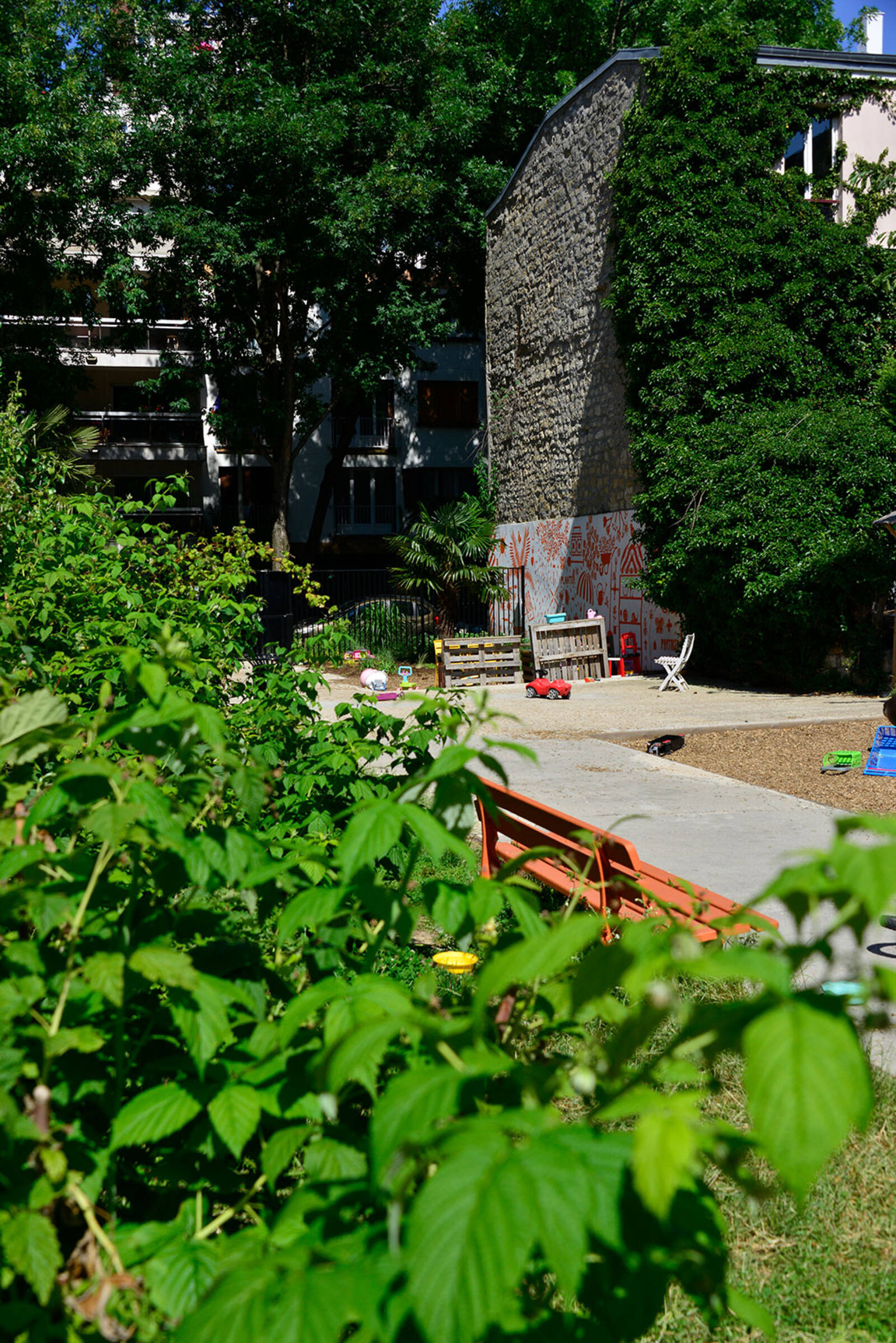 A l’intérieur, derrière une grille noire, le sol en béton rappelle le passé de la parcelle. Les aires de jeux sont organisées avec du sol amortissant en copeaux de bois et accueillent des jeux récupérés comme un gros chat en bois, un écureuil sur ressort (offert par la Ville de Freudenstadt, jumelée avec Courbevoie depuis 1961) et un petit toboggan.