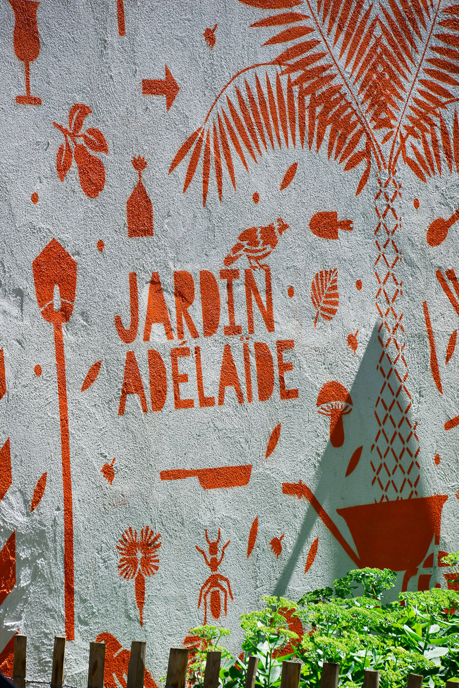 L'orange est la couleur emblématique de ce jardin avec des fresques murales rappelant l'univers des jardins à travers les plantes (cerise, feuillages, palmier…) l'outillage (arrosoir, brouette, fourche, pelle, râteau…), la faune (écureuil, escargot, fourmis, oiseau, papillon, poule…), mais aussi la cuisine (cocotte-minute, couverts, passoire, verre…), le tout ponctué de quelques verbes évocateurs (planteur, cultivateur, cuisiner, partager…).