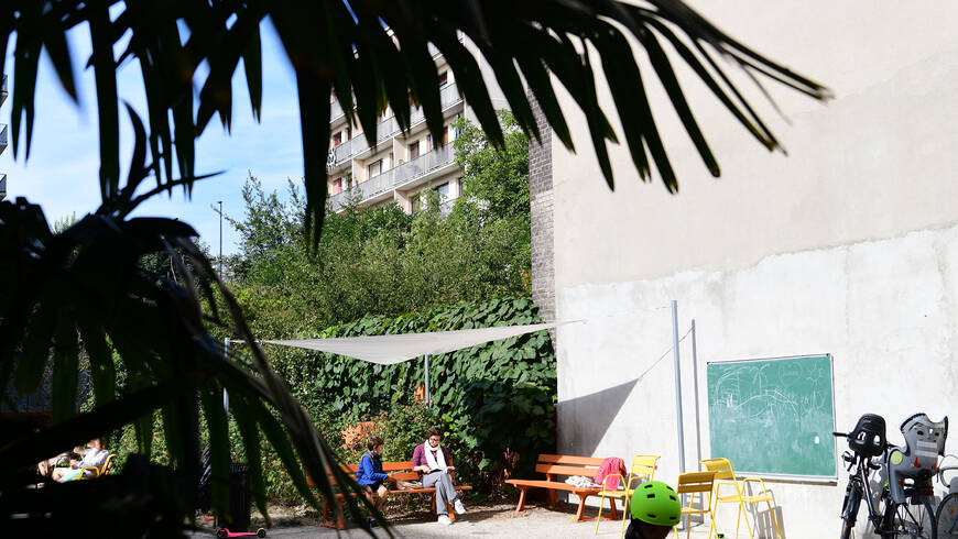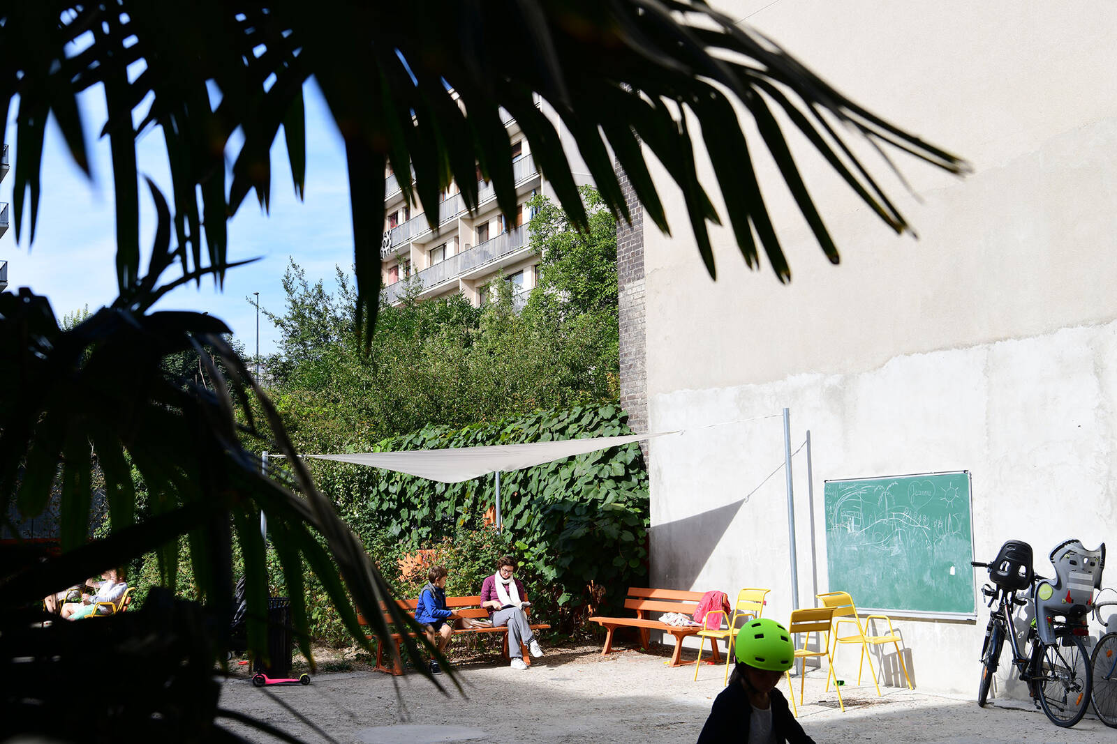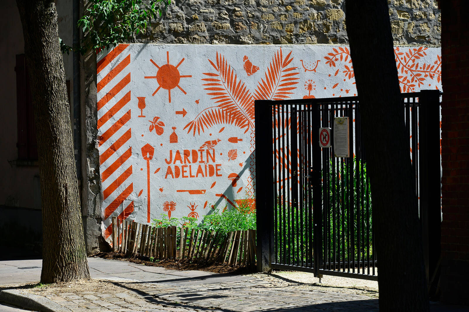 Au cours de ce chantier festif, fonctionnaires et riverains ont installé des mobiliers et planté des végétaux récupérés lors du démontage d’autres espaces publics. Son entrée est marquée par un pilier en briques et surtout par deux palmiers.