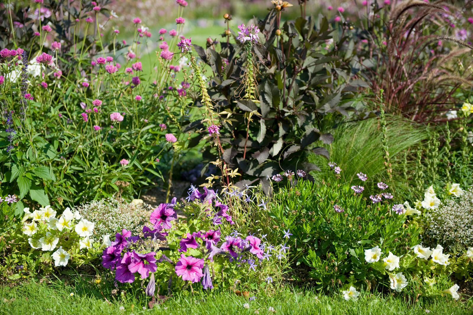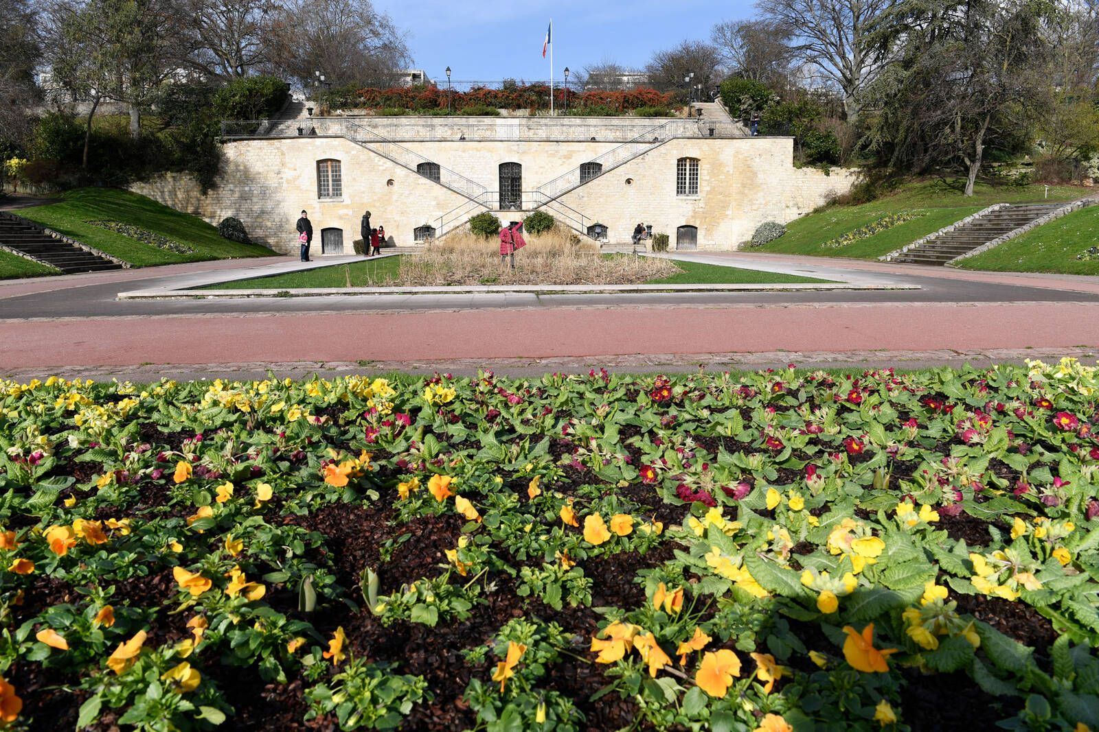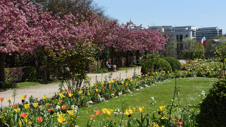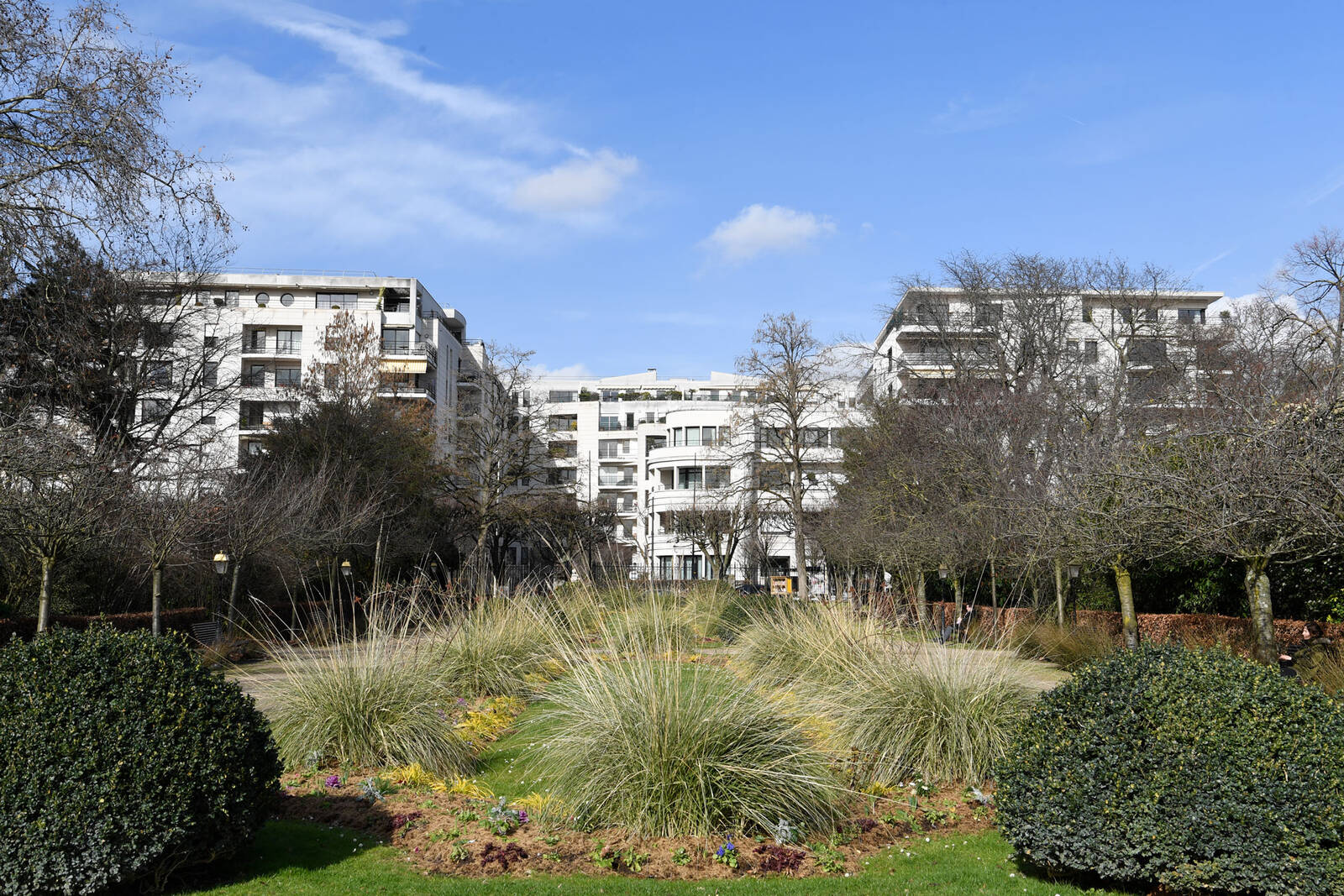 Depuis l’entrée principale, cadrée de chaque côté par un alignement de cerisiers des collines du Japon à port évasé (Prunus serrulata ‘Kanzan), et quatre boules de lauriers, le parterre de gazon est magnifié par le fleurissement saisonnier des jardiniers de la ville. La perspective centrale conduit jusqu’à la terrasse de l’ancien château depuis laquelle se découvre un exceptionnel panorama sur la Seine, Levallois-Perret, Paris et notamment la tour Eiffel.