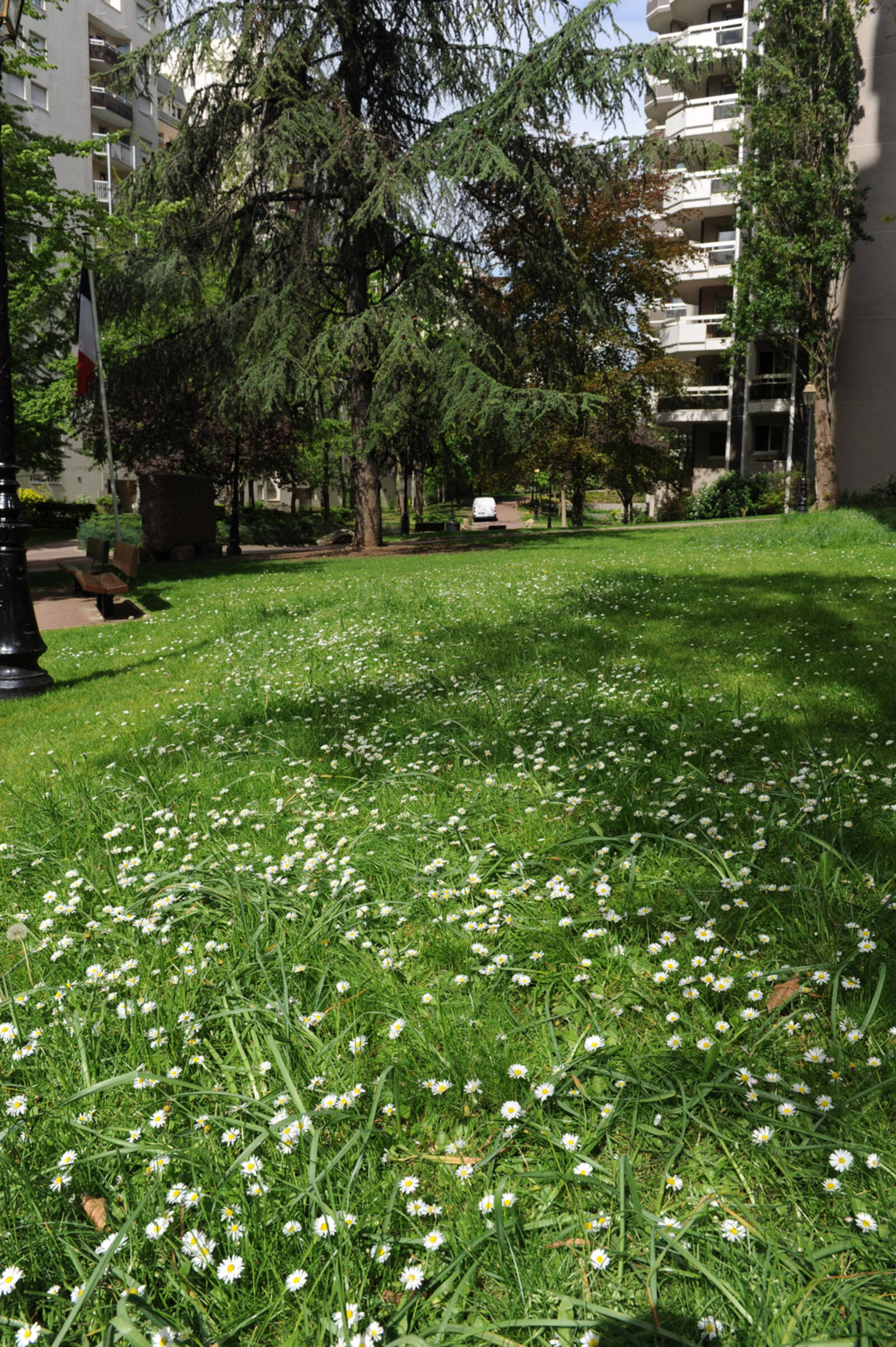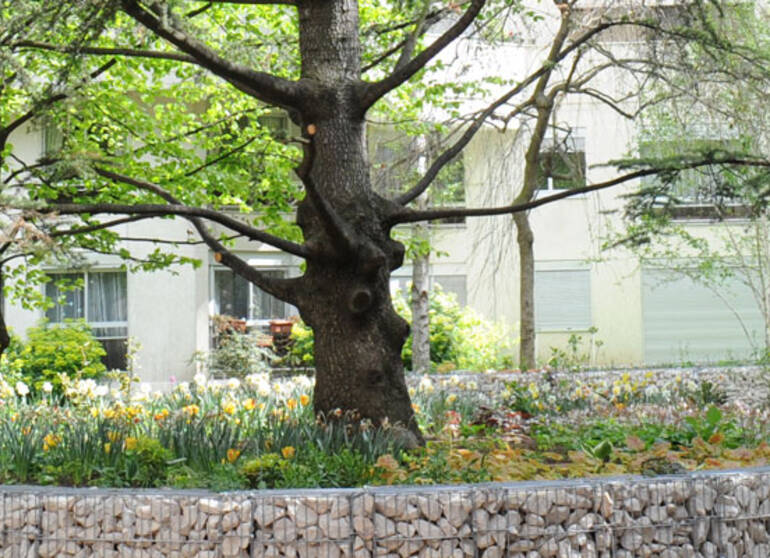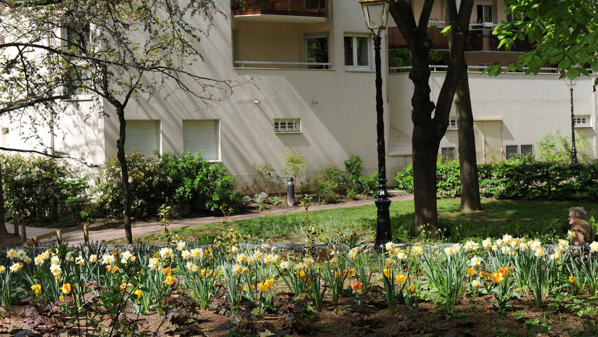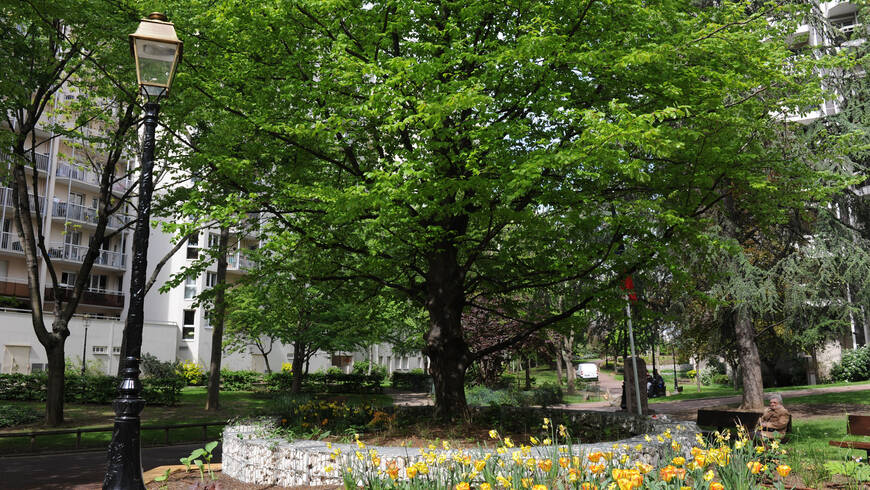 L'allée centrale en pavés de béton rouge et gris posés en rosace ou autobloquants est bordée de grands arbres (bouleaux, charmes, robiniers faux-acacias pyramidaux, tilleuls…) avec à leur pied des massifs arbustifs et de fleurissement saisonnier.