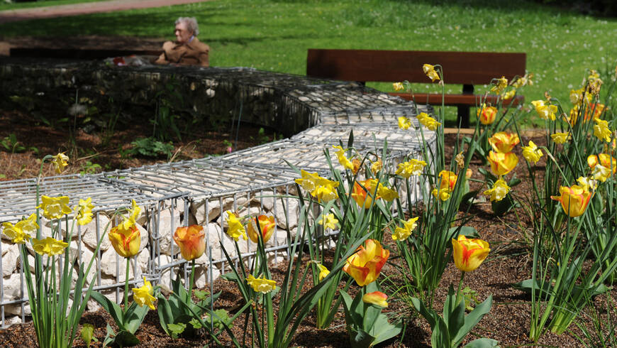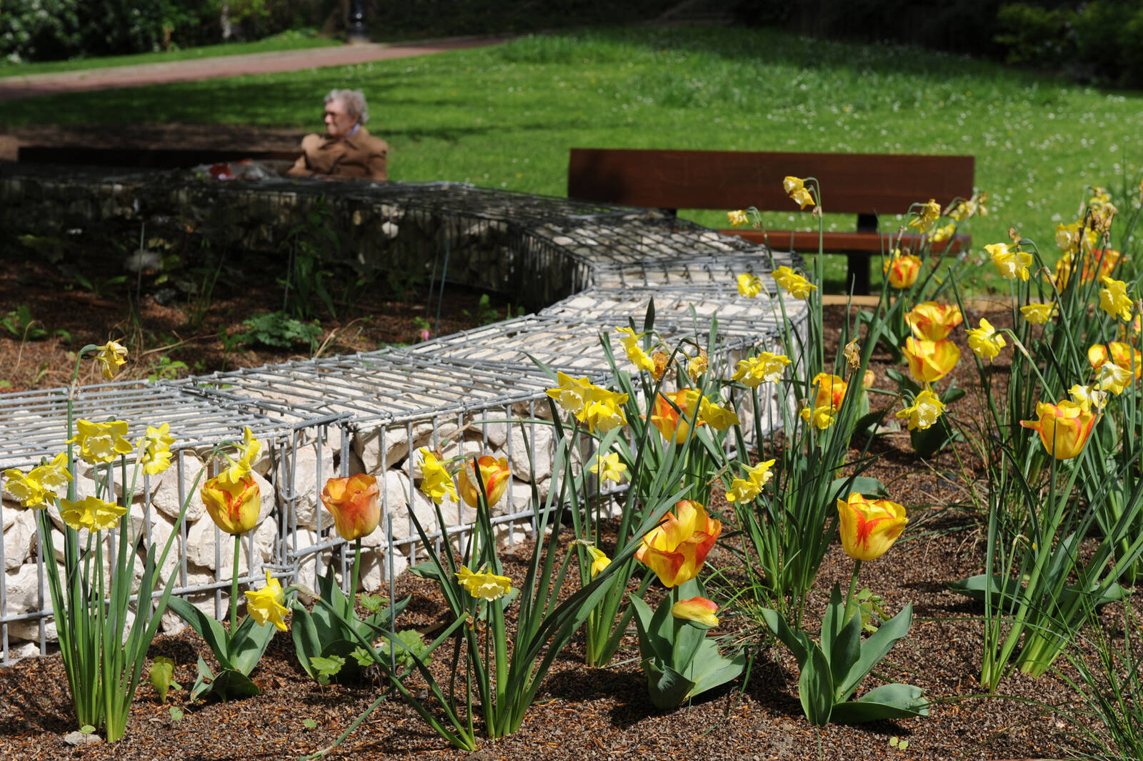 Des bancs et lices en bois et des blocs de roche renforcent l'aspect naturel du lieu, assuré également par un sous-bois de lierres, millepertuis, fougères et hellébores. Un aspect plus contemporain est assuré dans la partie sud-ouest par quatre jardinières en gabions (pierres empilées dans des armatures grillagées) de formes ovoïdes.