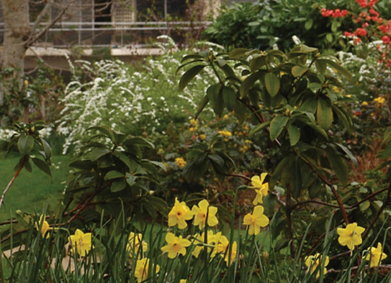 La strate arborée est composée de deux gros platanes, d'un érable à feuilles de frêne et d'un catalpa de Caroline . La partie centrale est une pièce de gazon légèrement vallonnée bordée de massifs arbustifs (corète du Japon, fuchsia, gattilier, saule à feuilles de romarin…). Au centre de celle-ci, l'aire de jeux circulaire au sol souple gris et rouge est nichée au cœur d'un massif arbustif accordant une place de choix aux plantes de terre de bruyère (rhododendrons, érables du Japon, hortensias à feuilles de chêne…), ifs, fuchsias et fougères.