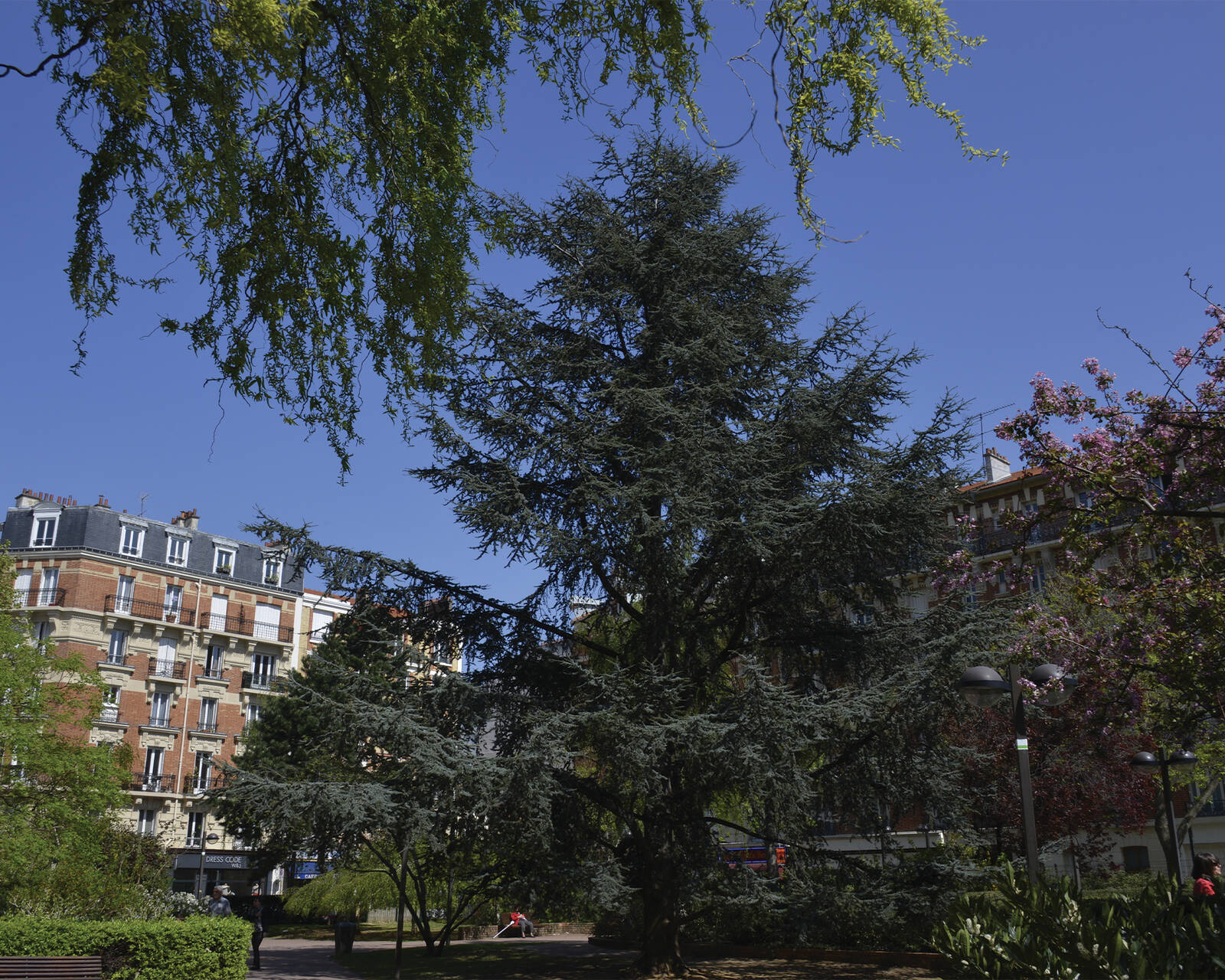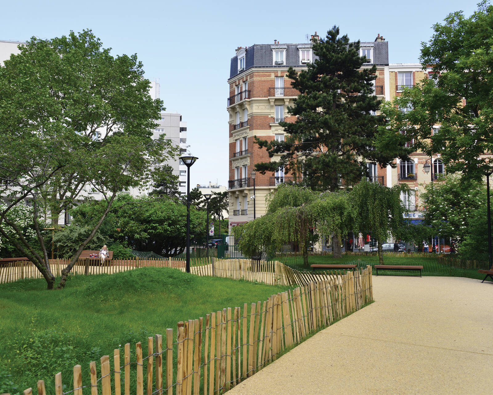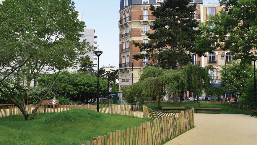 Intégralement réaménagé en 2017 et 2018, ce square est organisé autour d’une petite prairie centrale vallonnée plantée d’un cerisier à fleurs du Japon et d’un cèdre de l’Atlas.