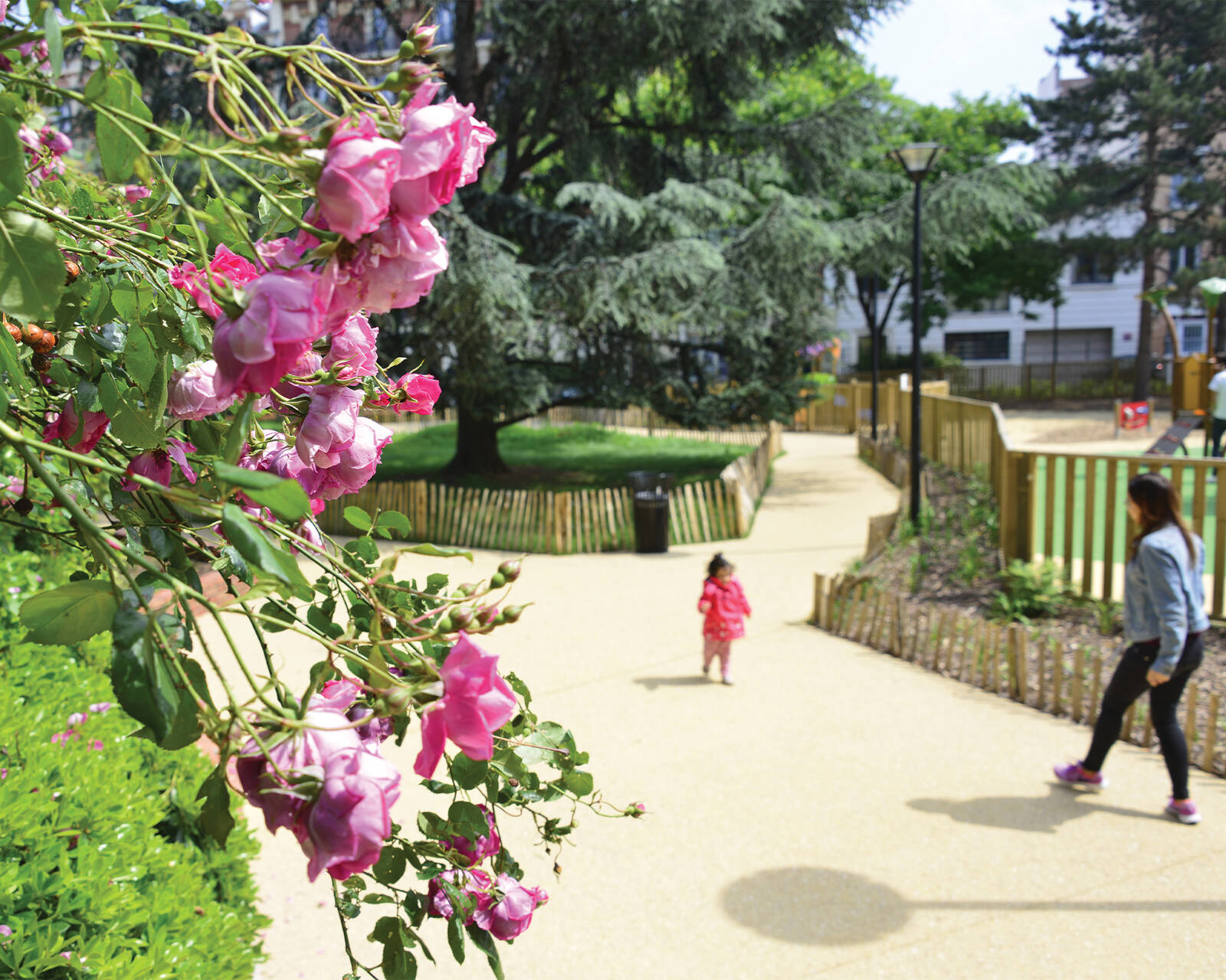 La partie ouest est marquée par des murets et jardinières en briques rouges se poursuivant à l’extérieur du square devant la mairie de quartier et le marché Villebois-Mareuil. Au sud, dans le fond du square, prend place une grande aire de jeux. Elle est délimitée par une élégante clôture en bois soulignée par des plantations colorées de rosiers et d’hémérocalles.