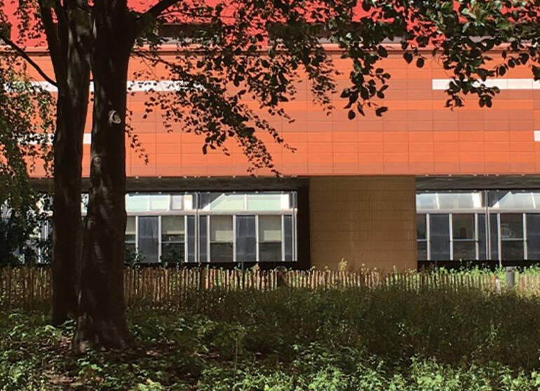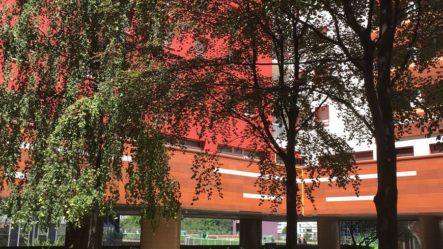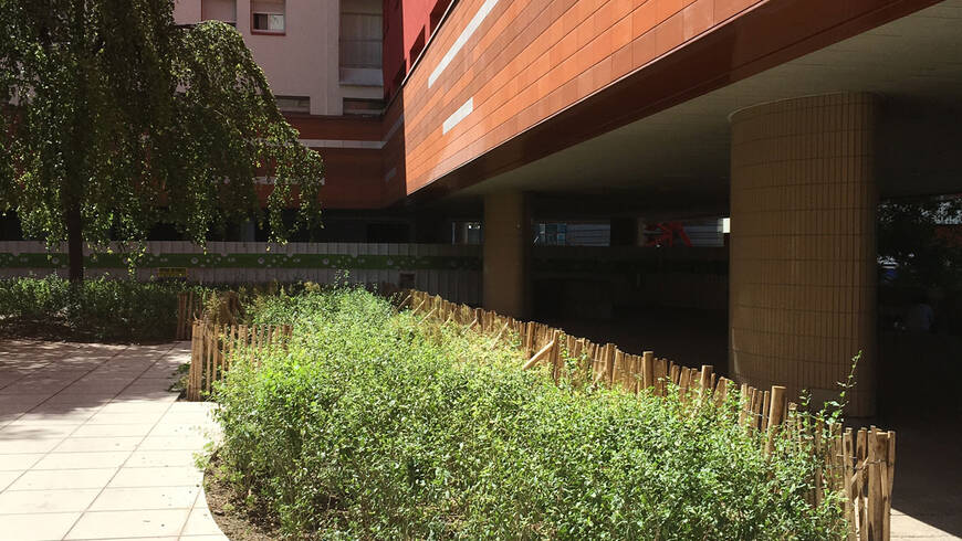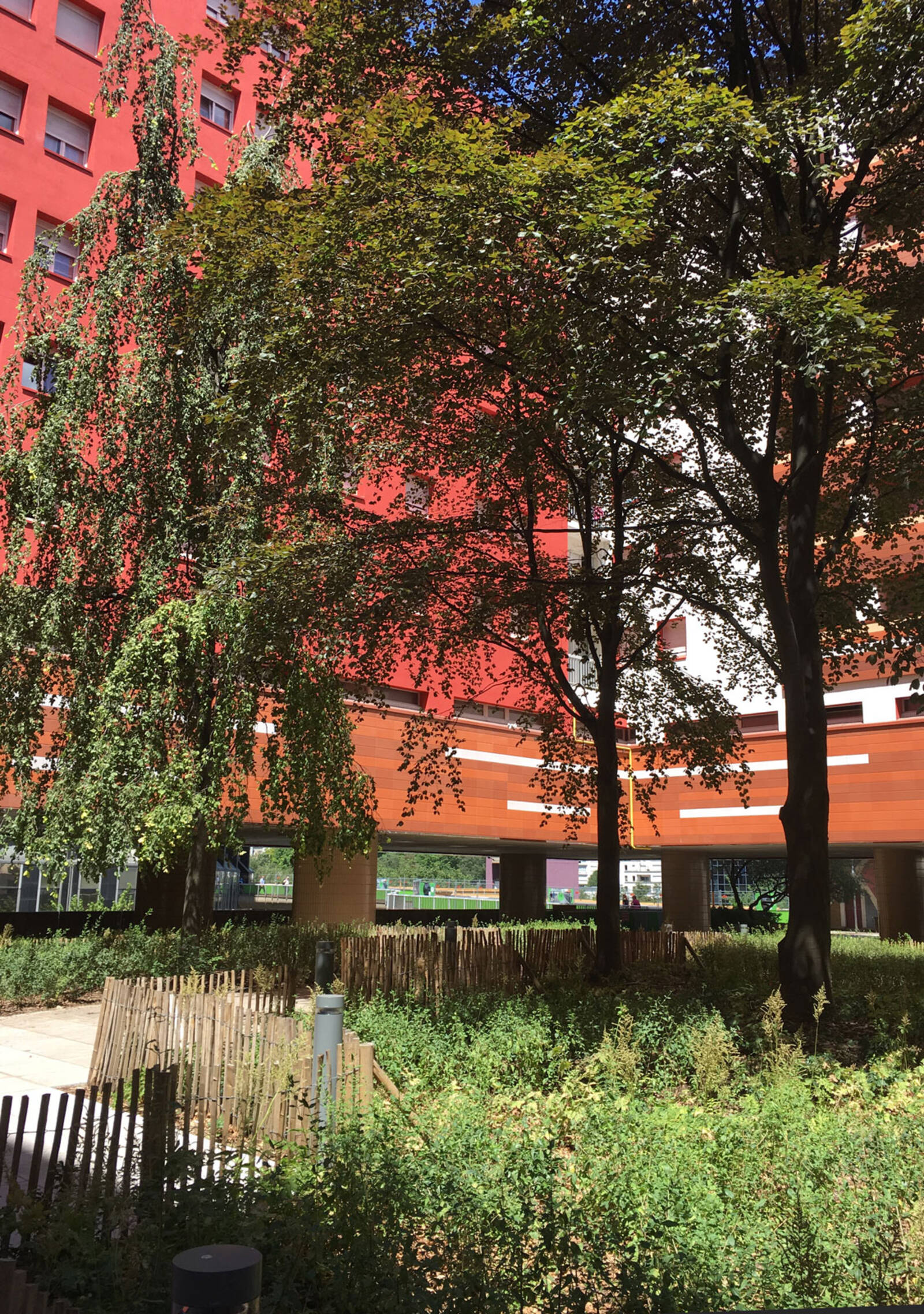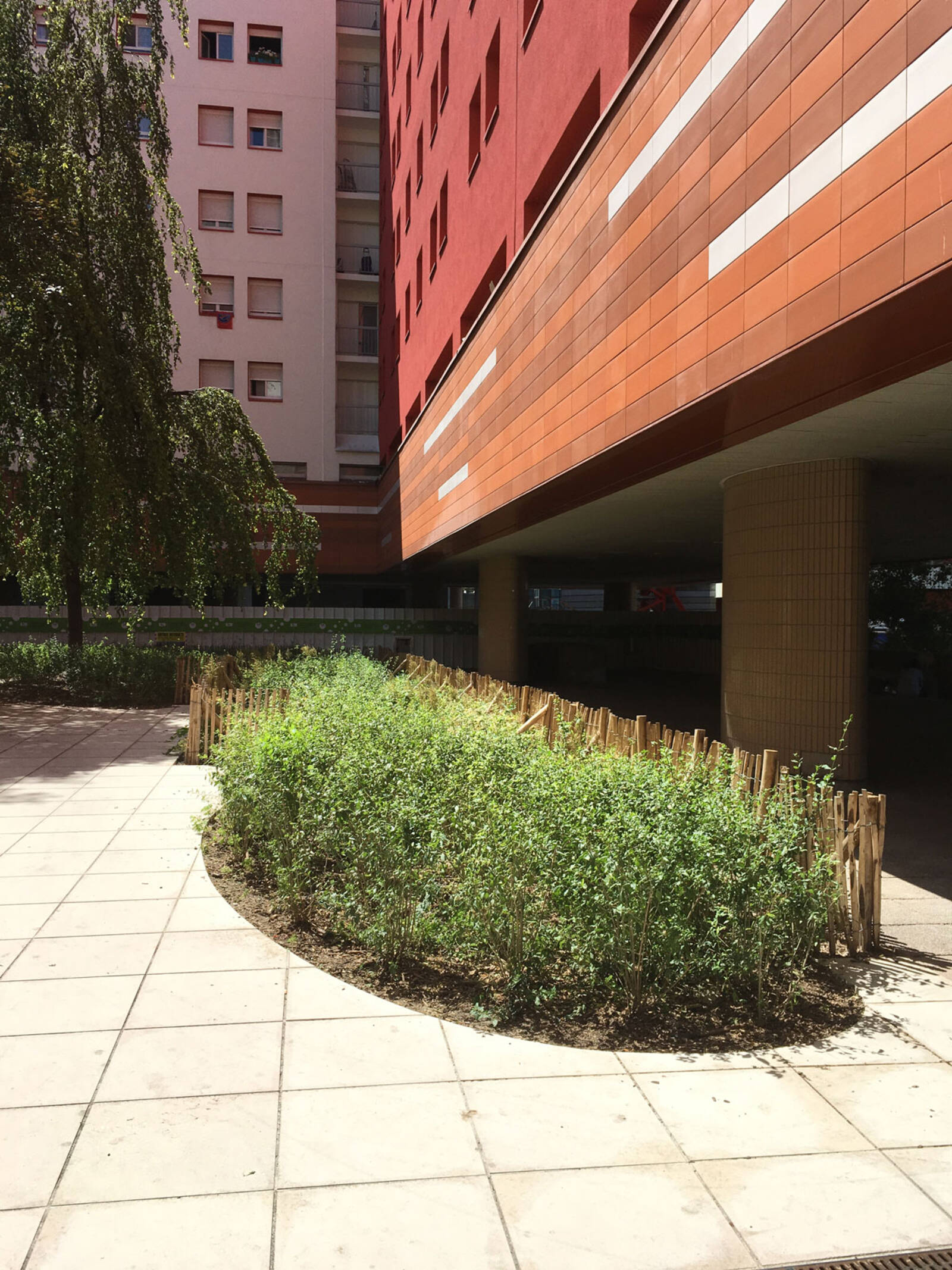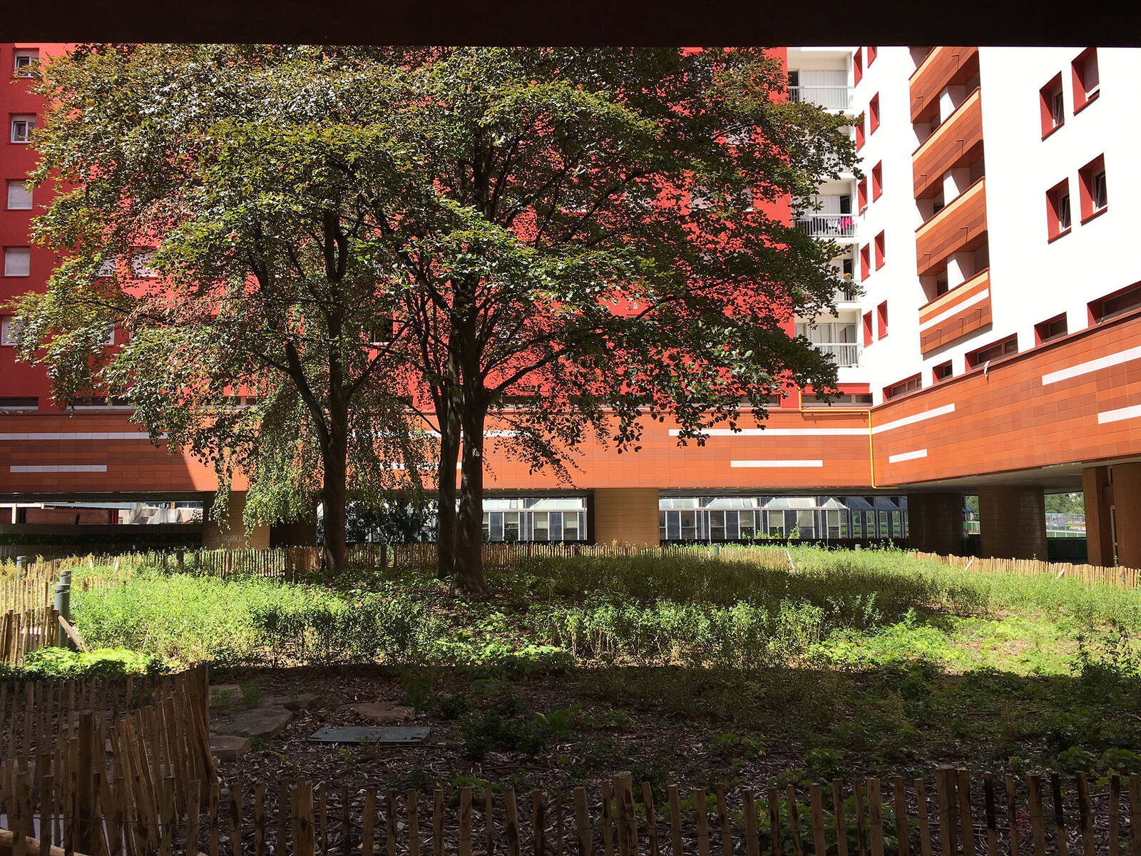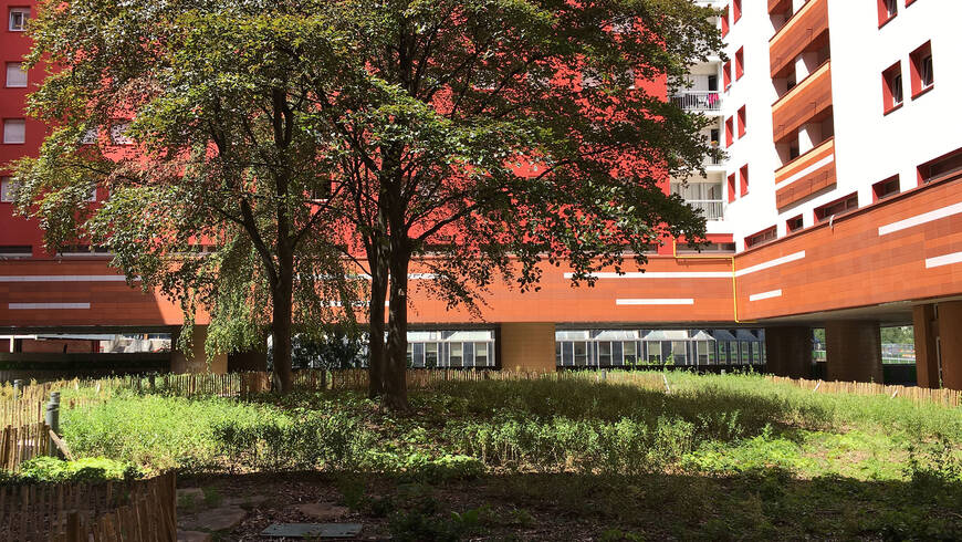 En levant la tête, au-dessus la cime des hêtres et de la toiture de la résidence, se distinguent les sommets des tours First, Alto et CB21. A proximité, le cadre de vie assez bétonné de la dalle de La Défense est animé, quant à lui, par une touche végétale devant l’ensemble de logements "Les Damiers" (1976) grâce à des magnolias à grandes fleurs (Magnolia grandiflora) dans des bacs d’orangerie en bois.