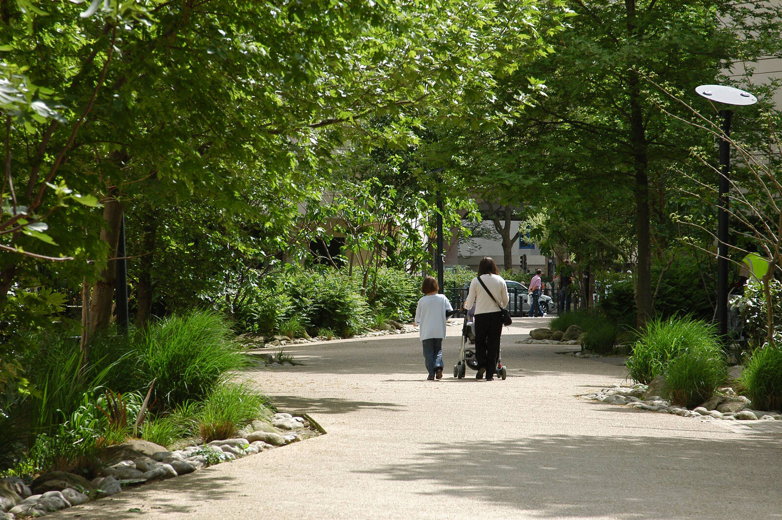Cet îlot de fraîcheur arbore des ambiances dépaysantes en plein centre-ville dans lesquelles les arbustes débordent sur les allées ou à travers des clôtures basses en croisillons de bois, composant un véritable sous-bois. Des hortensias apportent des floraisons aux couleurs claires dans cet espace très vert. Rejoignant la rue Kléber au sud-ouest, la rue de Colmar est, quant à elle, égayée par les floraisons roses de lilas des Indes chaque été. Après avoir passé le porche à l’angle de la rue de Bezons et de la rue de Belfort, les plus jeunes peuvent apprécier sur leur gauche une aire avec des jeux sur ressort et, sur leur droite, un portique et deux tables de ping-pong.