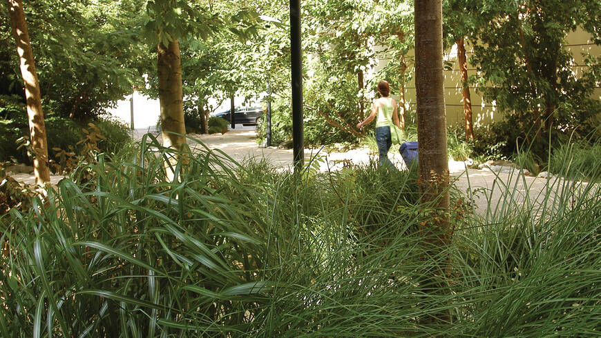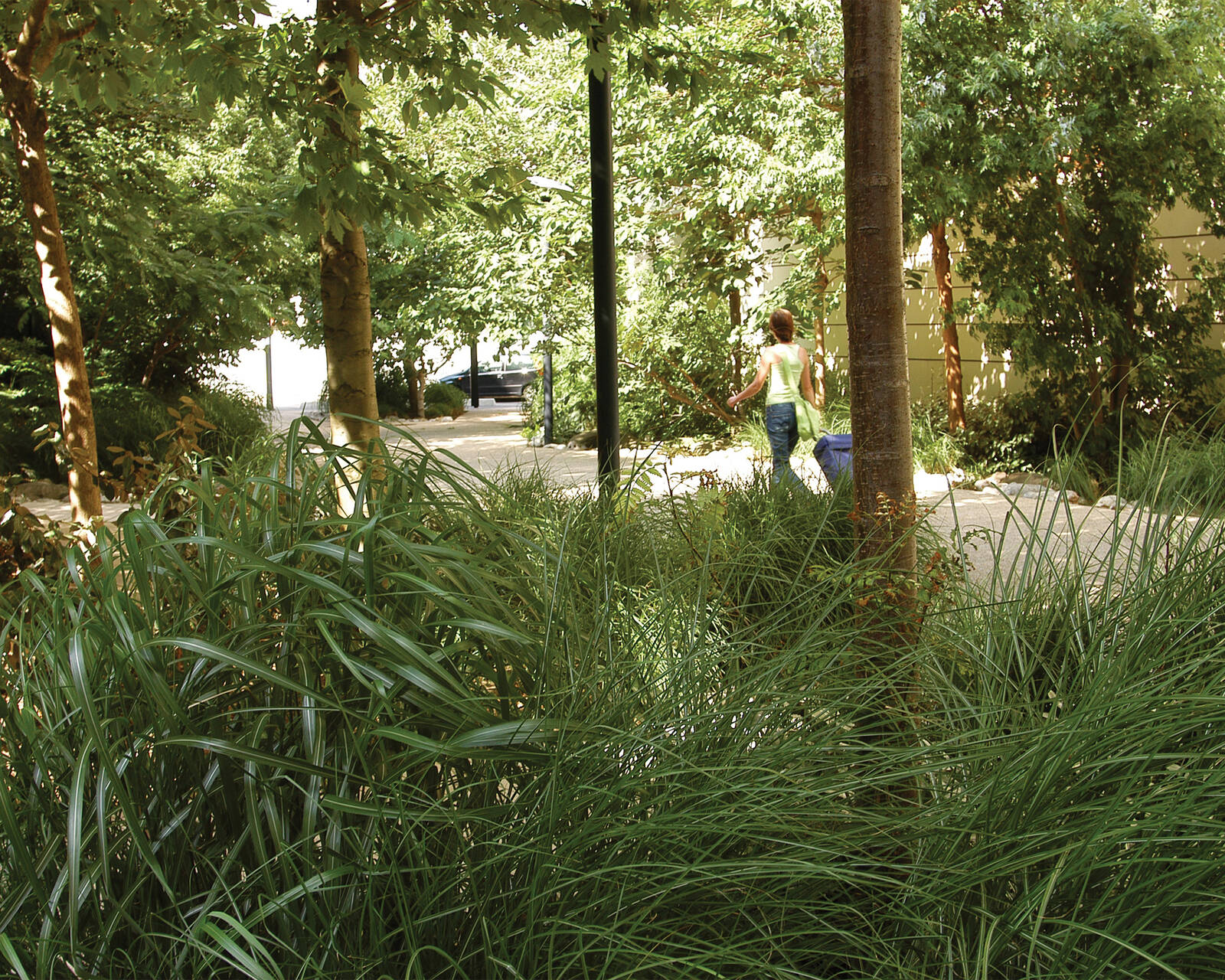 Les riverains ayant des fenêtres ou un balcon sur cette promenade ou le restaurant ayant une véranda en contact direct bénéficient tous ainsi de vues privilégiées sur ce lopin de nature en ville. En effet, coupée en deux par une grande allée piétonne en béton désactivé bordée de galets et rochers renforçant son aspect naturel, cette promenade développe une ambiance particulière due à ses grands arbres (acacias de Constantinople, alisiers, figuiers, mûriers, néfliers communs, platanes d’Orient, saules…). Ceux-ci ombragent un couvert de chalefs, eulalies, fatsias du Japon, fougères, hortensias, laîches, orangers du Mexique…
