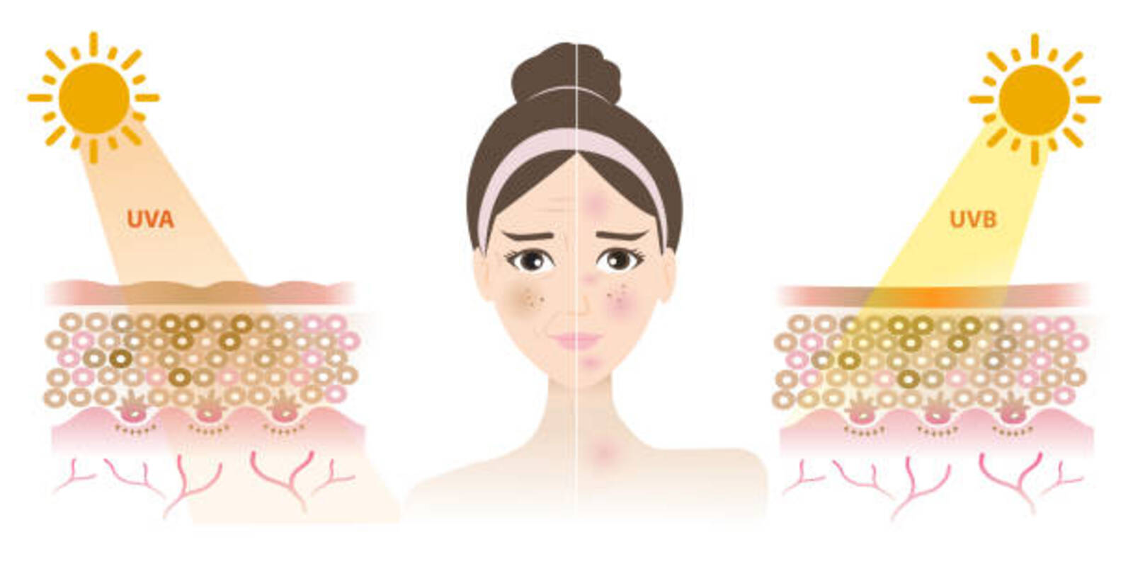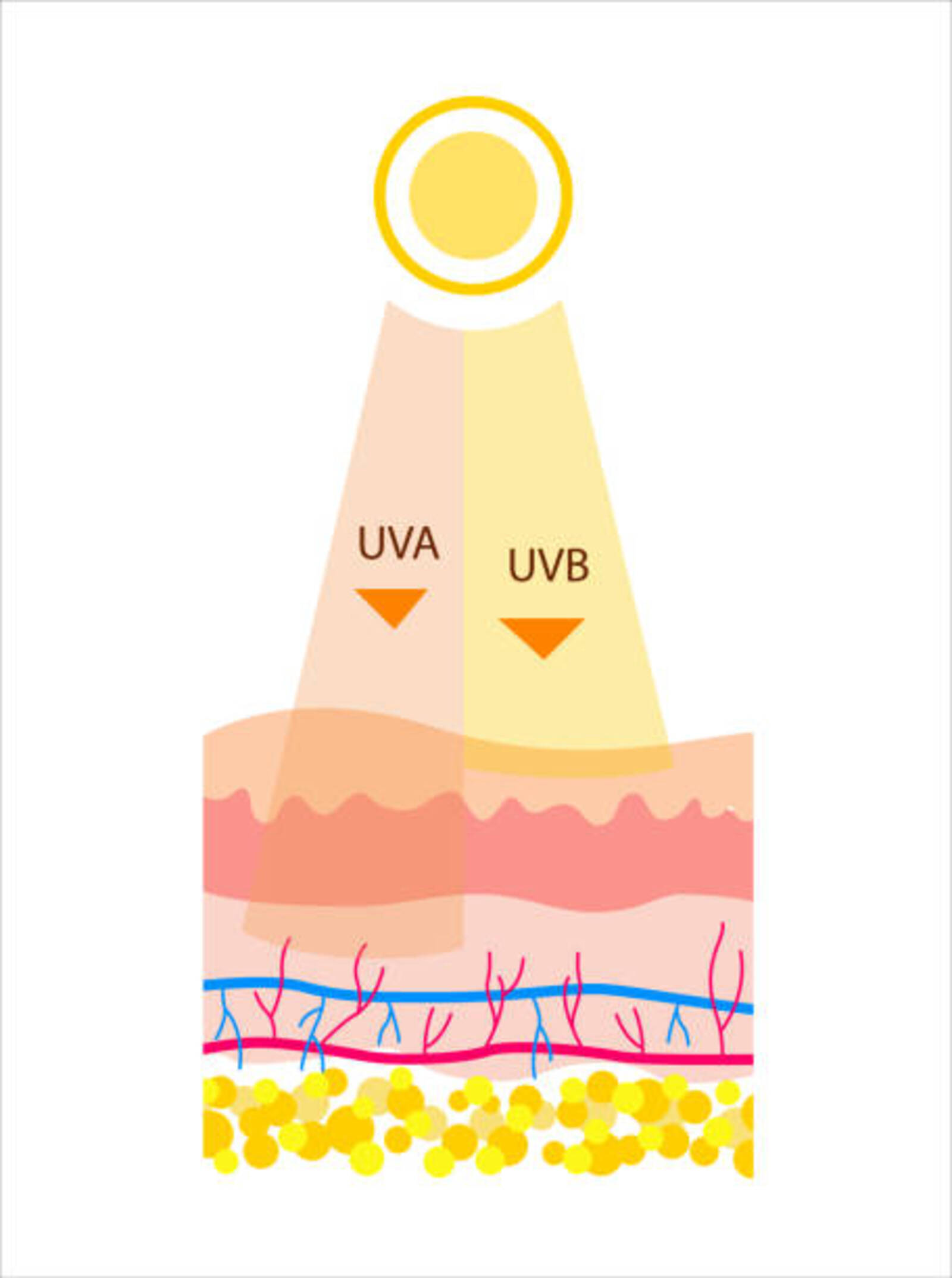 Les ultraviolets (UVA et UVB) sont des rayonnements émis par le soleil que l’on reçoit à la surface de notre peau. Les UVB vont pénétrer plus profondément dans la peau et être responsables de brûlures et coups de soleil. Les UVA vont pénétrer moins profondément et provoquer le vieillissement cutané. En quantité, on reçoit beaucoup plus d’UVA qui sont très peu filtrés par l’atmosphère que d’UVB qui sont mieux filtrés ; environ 95% d’UVA arrivent à la surface de la terre contre 5% d’UVB.