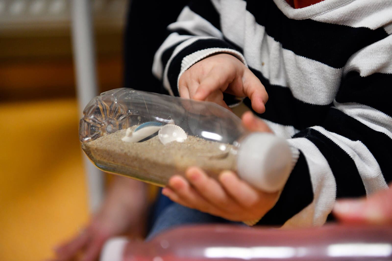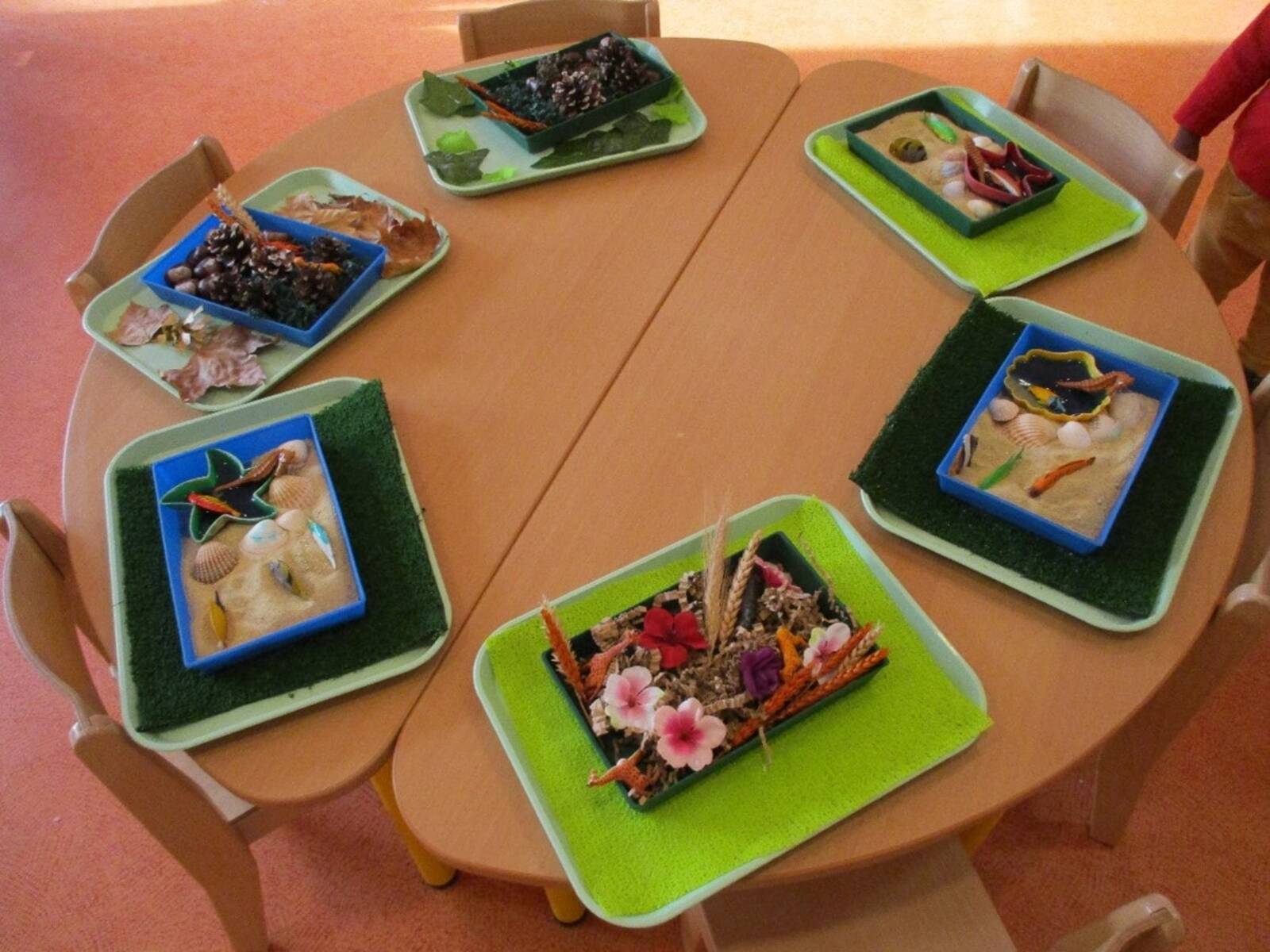 - Récupération de matériels (bouteilles vides, barquettes des repas…) et d’éléments naturels (marrons, feuilles, …) pour les transformer en jeux ou pour proposer des ateliers de manipulation.