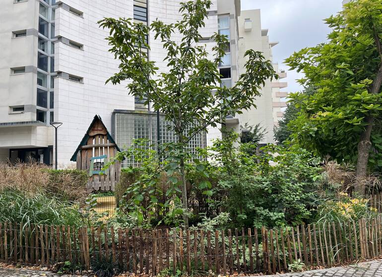 Telle une île au milieu d’une place en pavés de granit gris, ce square est essentiellement constitué d’une aire de jeux délimitée par une haie de buis, au pied de trois catalpas et d’un magnolia. Cette aire de jeux avec bancs sculptés a pour thème la mer, interprétée ici grâce à un sol souple amortissant de couleurs bleue (l’eau) et sable (la plage) avec des jeux évocateurs : un navire en rondins, un dauphin sur ressort côté mer, une cabane sur pilotis avec glissière, un escargot sur ressort et un amusant pou sur ressort côté terre. Cette scénographie vaut à ce square le surnom un peu emphatique de « parc des Pirates ». Elle fait oublier la première version de ce square créé au même moment que le parc Millénaire-Charles Deprez. La première aire de jeux, conçue en 2000 par l’Atelier de Launay avait alors pour thème les études sur le mouvement des animaux dans l’œuvre de Léonard de Vinci. Devenue vétuste, elle a ensuite été remplacée en 2016 par ces jeux d’inspiration marine. En partie extérieure du square, au pied de la haie de buis, sont à apprécier des plantes comme alstromère, cornouiller à bois rouge, fatsia du Japon, heuchère, marguerite de la savane, noisetier commun, physocarpe, rudbeckie, spirée, sans oublier l’étonnant ophiopogon à feuillage noir. Sous les tilleuls argentés des allées autour de la place, pousse la même végétation complétée par des hellébores. Lors de la rénovation du square, les sols ont aussi été en partie déminéralisés tandis que l’asphalte conservé était repeint avec des pistes de courses et des marelles aux couleurs vives.
