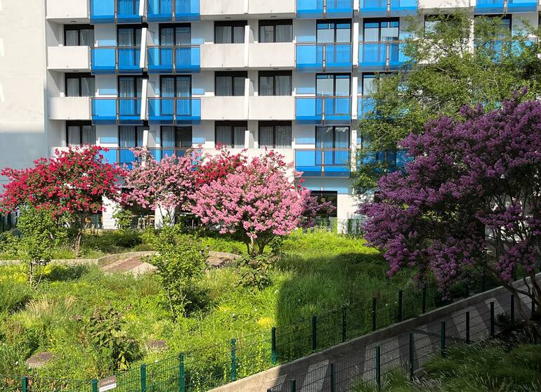 En été, lors de la floraison des lilas des Indes, avec les balcons bleus de l’hôtel Les Citadines La Défense Paris, ce square devient un lieu autant coloré qu’harmonieux.